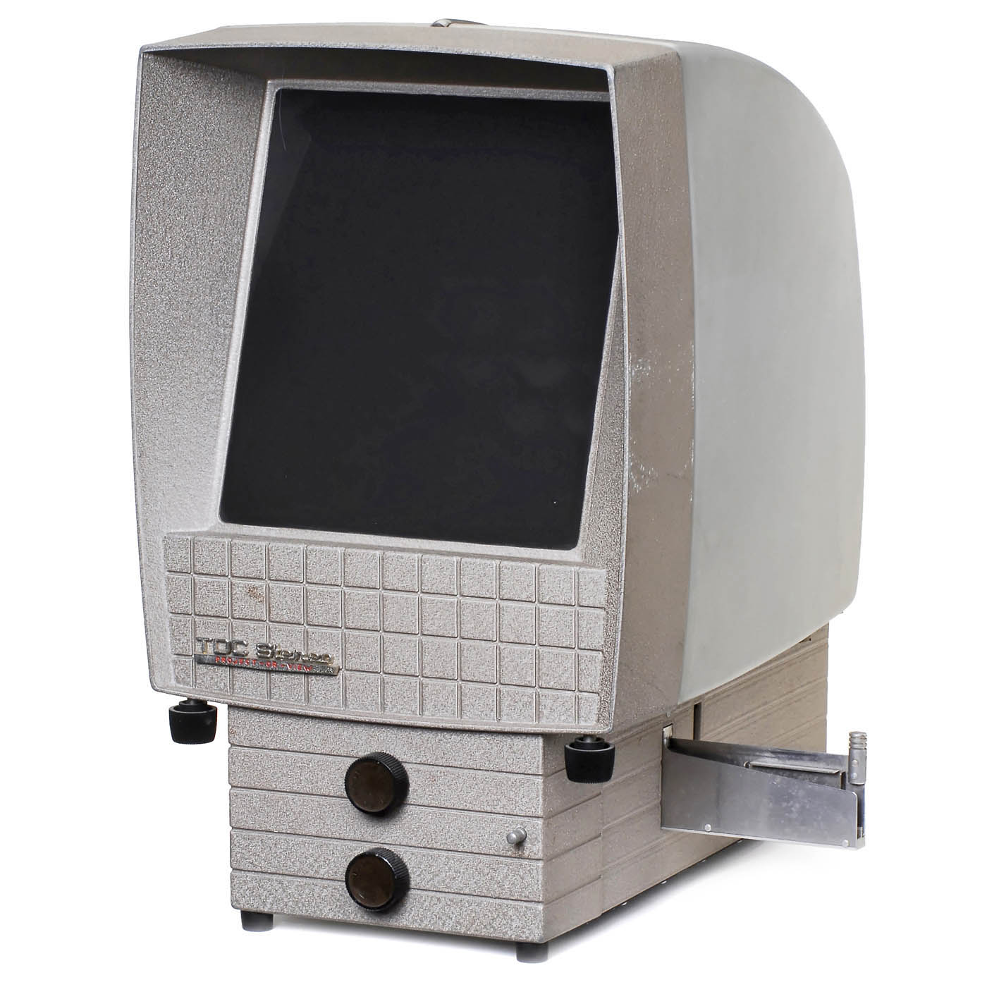 Three Dimension Co., Chicago, USA. Projector for stereo slides of 41 x 101 mm, for projecting on a screen or on a built-in ground-glass, built-in polarizing filters, illumination via 2 lamps 115 V (300 watts), with fan, focusing and image separation via knobs on the front plate, with slide carrier.
