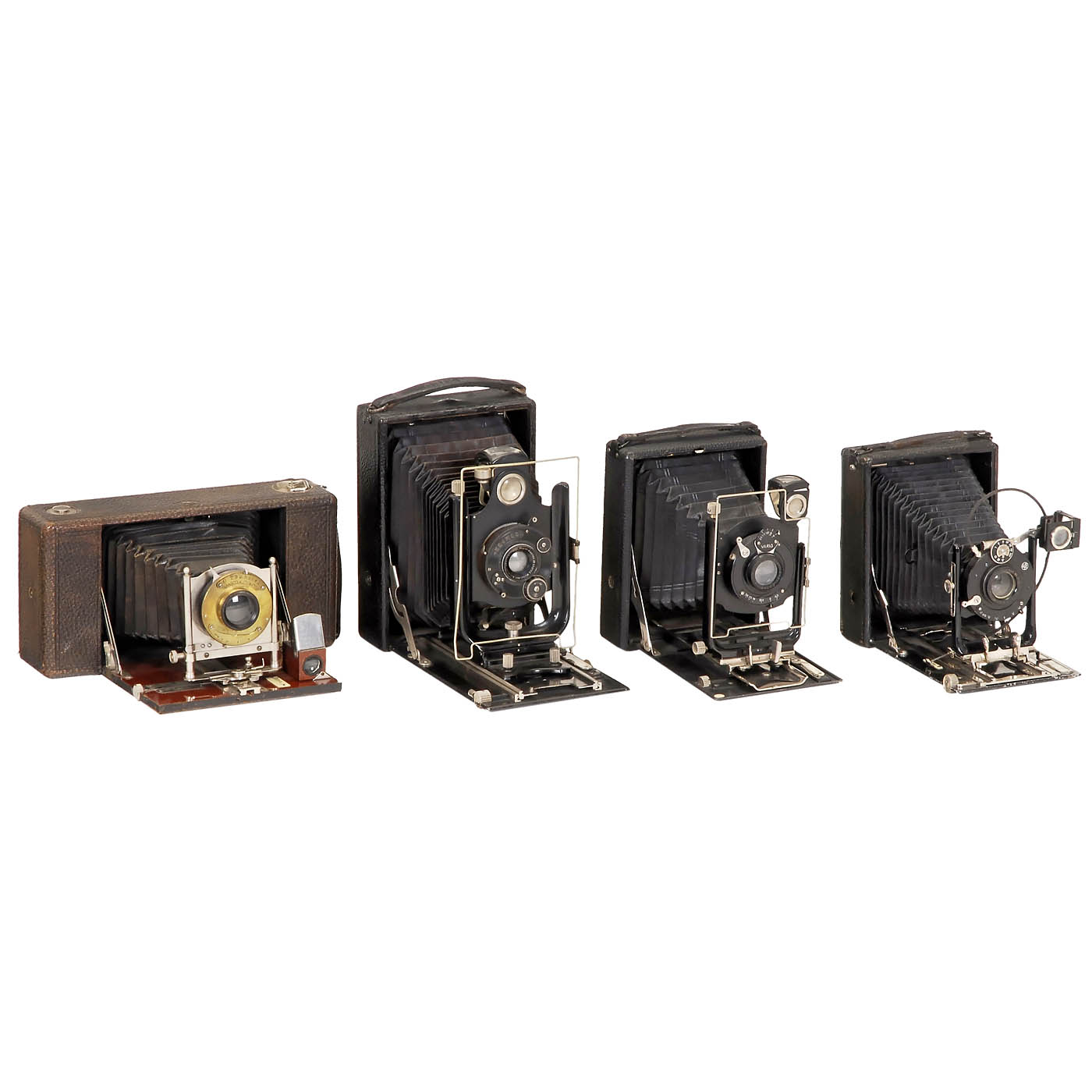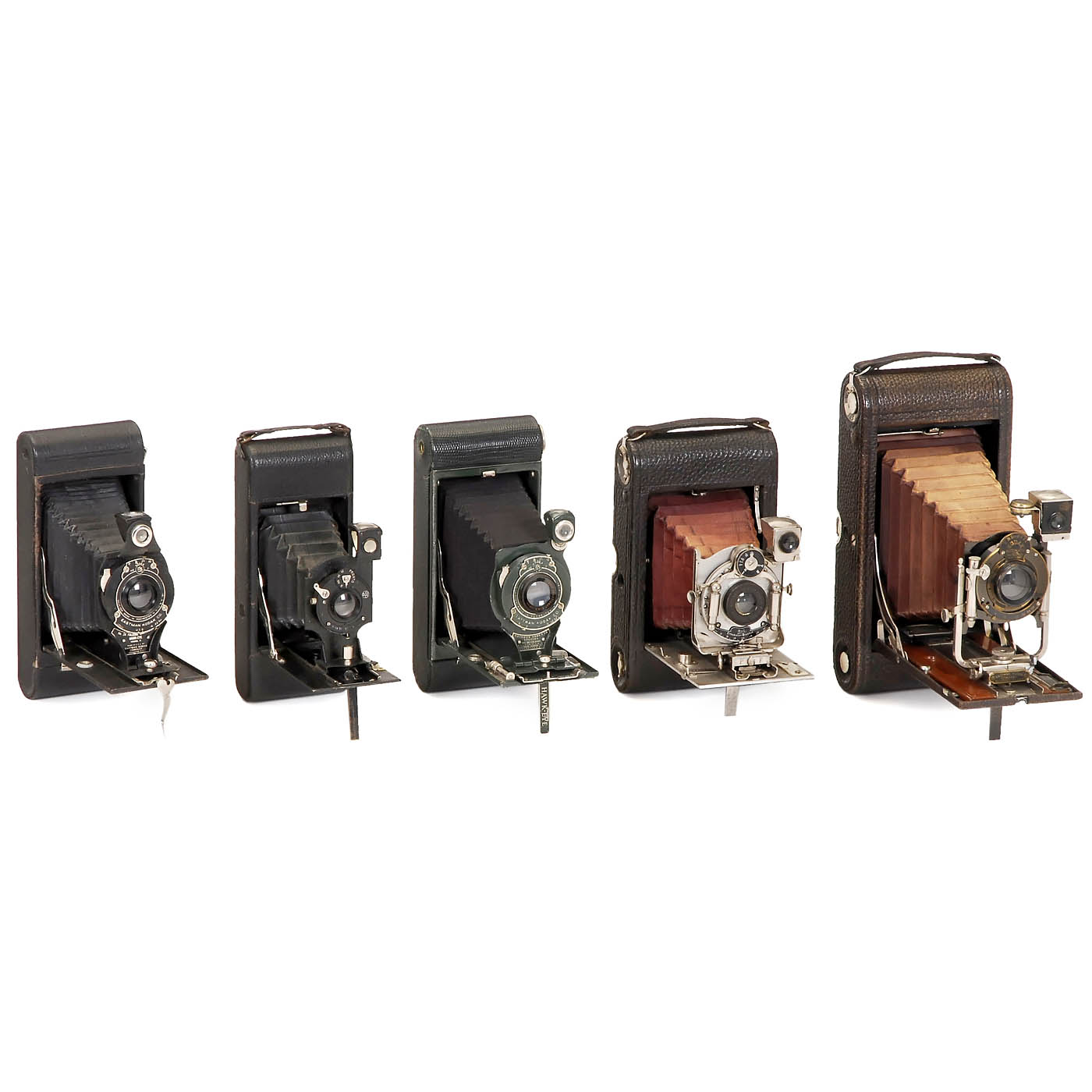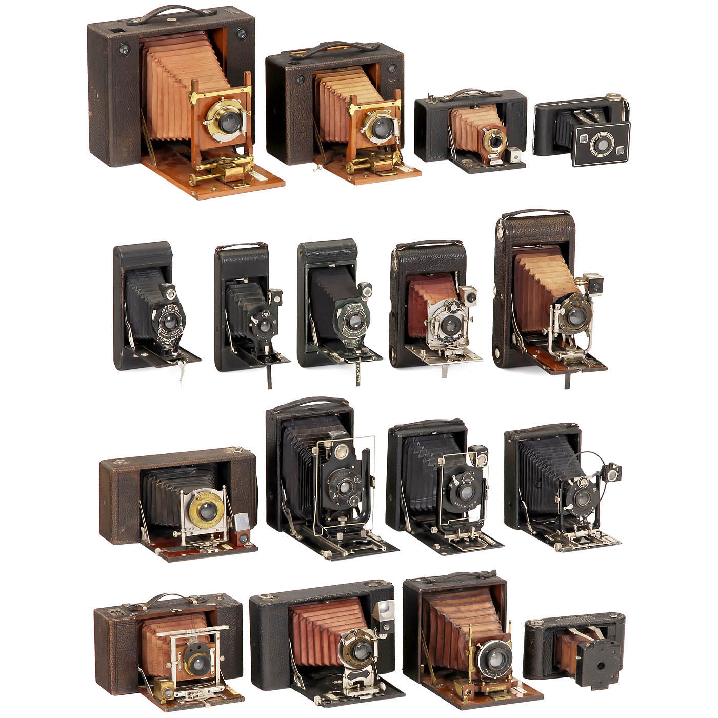 Cameras made by: Kodak, Krügener, Ernemann, ICA, Ansco, Orionwerk, Monroe and others. 1) No. 5 Cartridge Kodak. - 2) No. 4 Cartridge Kodak. - 3) No. 2 Folding Brownie. - 4) No. 4 Folding Hawk-Eye Model 3. - 5) No. 3A Folding Pocket Kodak. - 6) No. 1 Folding Pocket Kodak. - 7) No. 2A Folding Rainbow Hawk-Eye Special, green. - 8) No. 2A Folding Cartridge Hawk-Eye. - 9) Jiffy Kodak Six-20 Series II. - 10) Krügener Delta Cartridge 10 x 12,5. - 11) Ernemann Bob. - 12) ICA Orix 308. - 13) No. 10 Ansco Model B. - 14) Orionwerk Rio 79 C. - 15) Monroe No. 4. - And: 16) 2 other unmarked plate cameras.