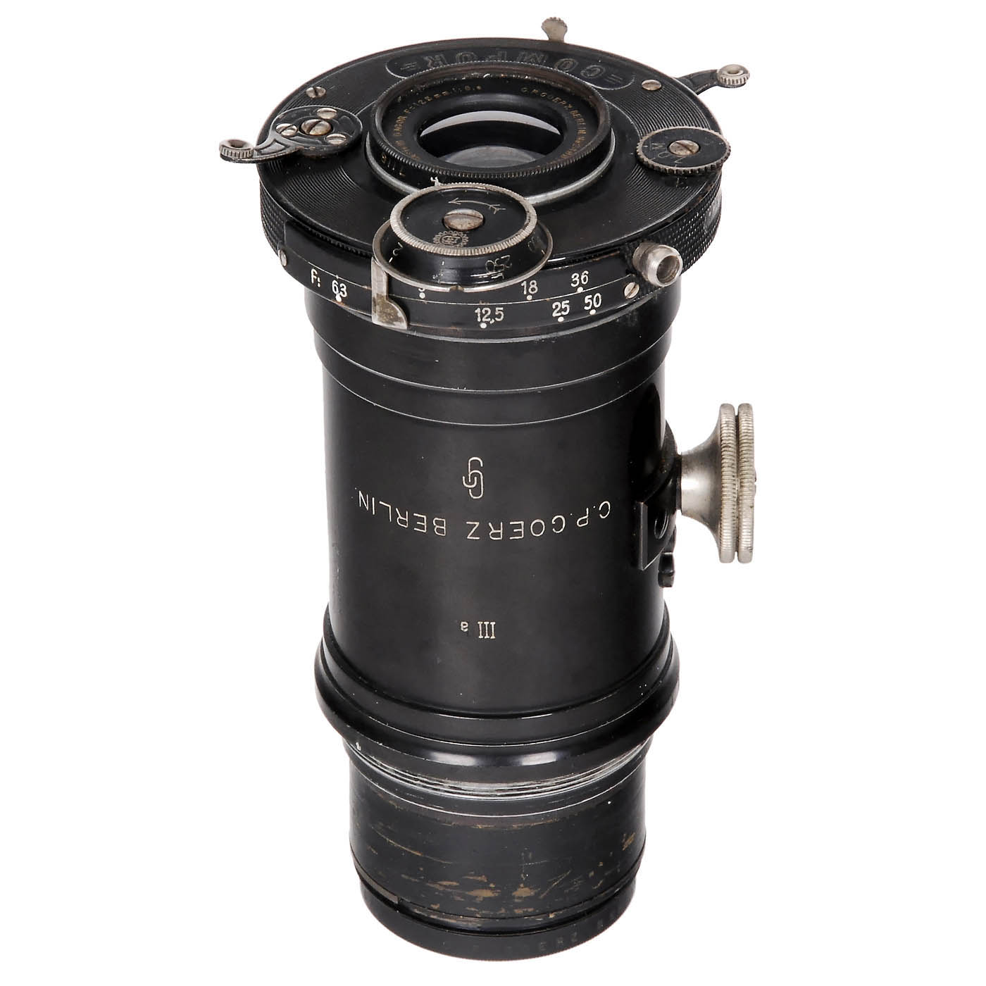 Sanderson Camera Works, England. Plate size 3 ¼ x 4 ¼ in., rotating back, teak body with brass fittings, black bellows, focusing screen back. With "the golden Dagor" 6,8/125 mm Dopp.-Anastigmat Serie III, interesting design with integrated extension tube. Back-mounted Tele-Negativ IIIa F = 60 mm, in Compur, serves as focal length extension (up to approx. 800 mm). Retailer's plaque: "J.B. Watson, Edinburgh".