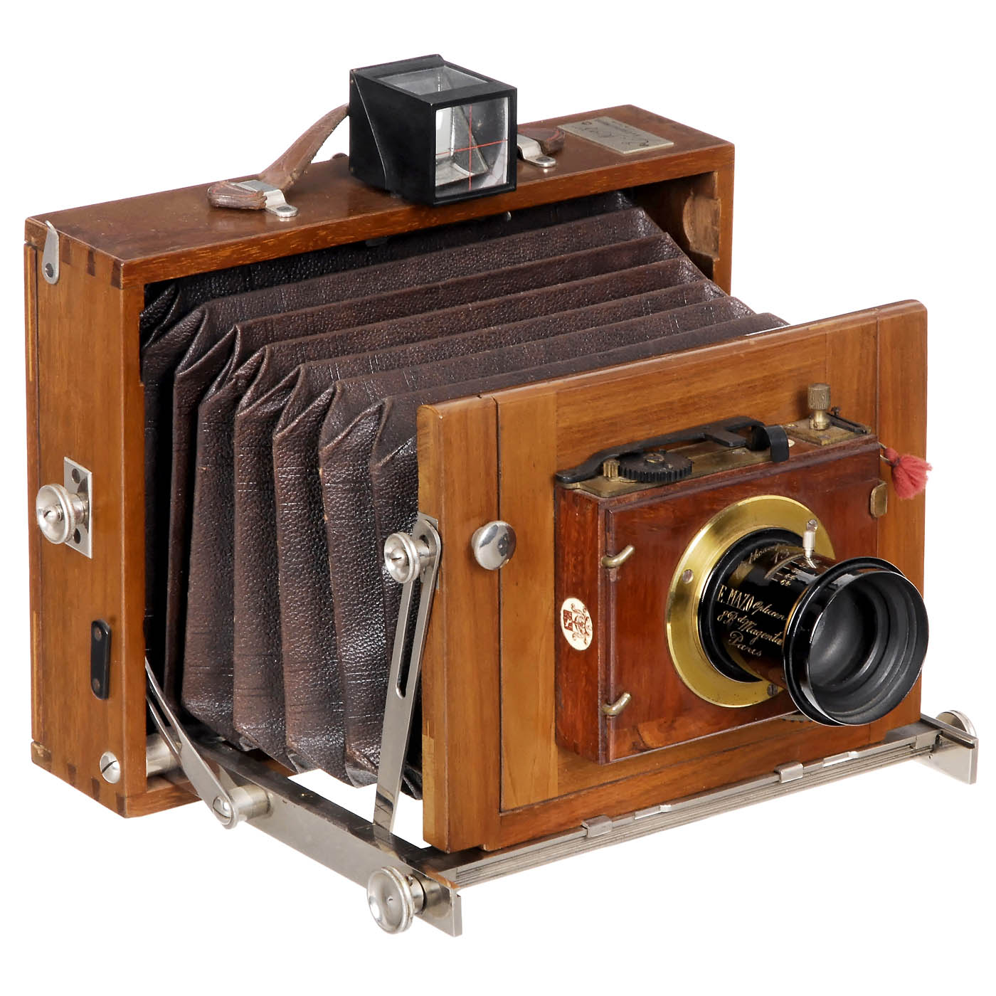 E. Mazo, Paris. Plate size 13 x 18 cm (5 x 7 in.), walnut with nickel fittings, dark-brown bellows, original slip-on viewfinder (mostly missing), focusing screen back. Lens: Orthoscope Rapide 13 x 18 cm by E. Mazo, iris stop, rollerblind shutter.