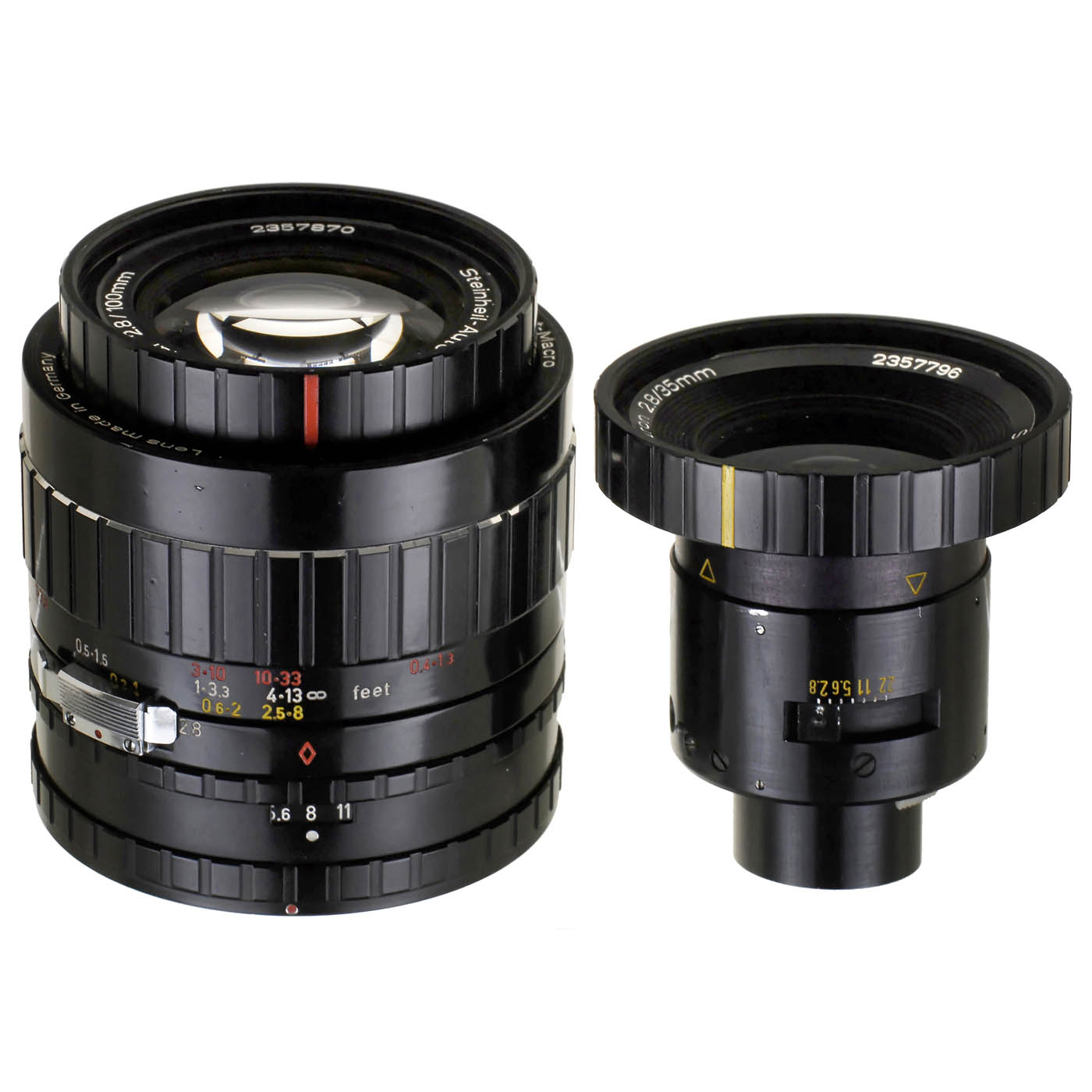 Steinheil, München. 1) Steinheil-Auto-Adapt.-Macro-Quinaron 2,8/35 mm (no. 2357796) - 2) Steinheil-Auto-Adapt.-Macro-Quinar 2,8/100 mm (no. 2357870). - 3) Steinheil Macro-Teleskop. - And: 4) Special adapter for Canon FL, Exakta and Praktica. - In addition: Canon-FT body and brochure (60 x 42 cm) - Only 3 lenses of this type produced, these never came onto the market. - In addition: Helmut Franz and Eduard Reutinger, "Steinheil - Münchner Optik mit Tradition", see p. 416. - Rarity!