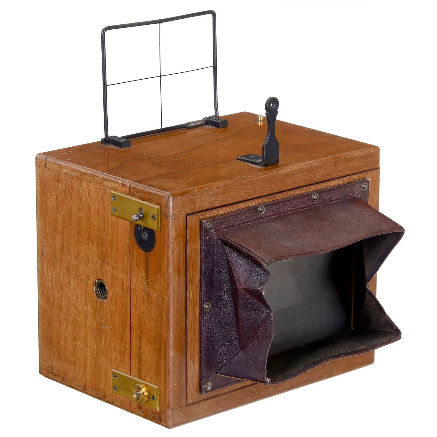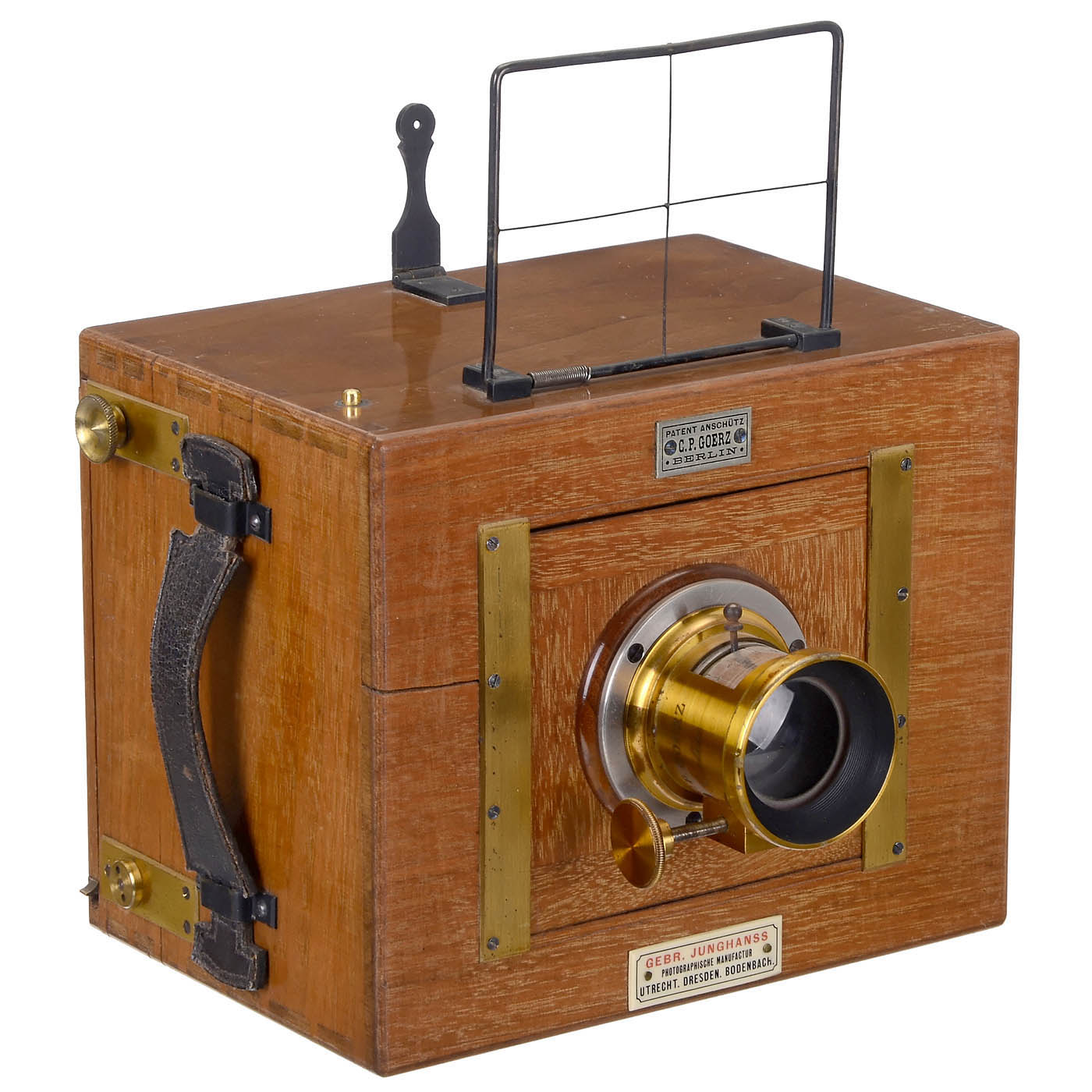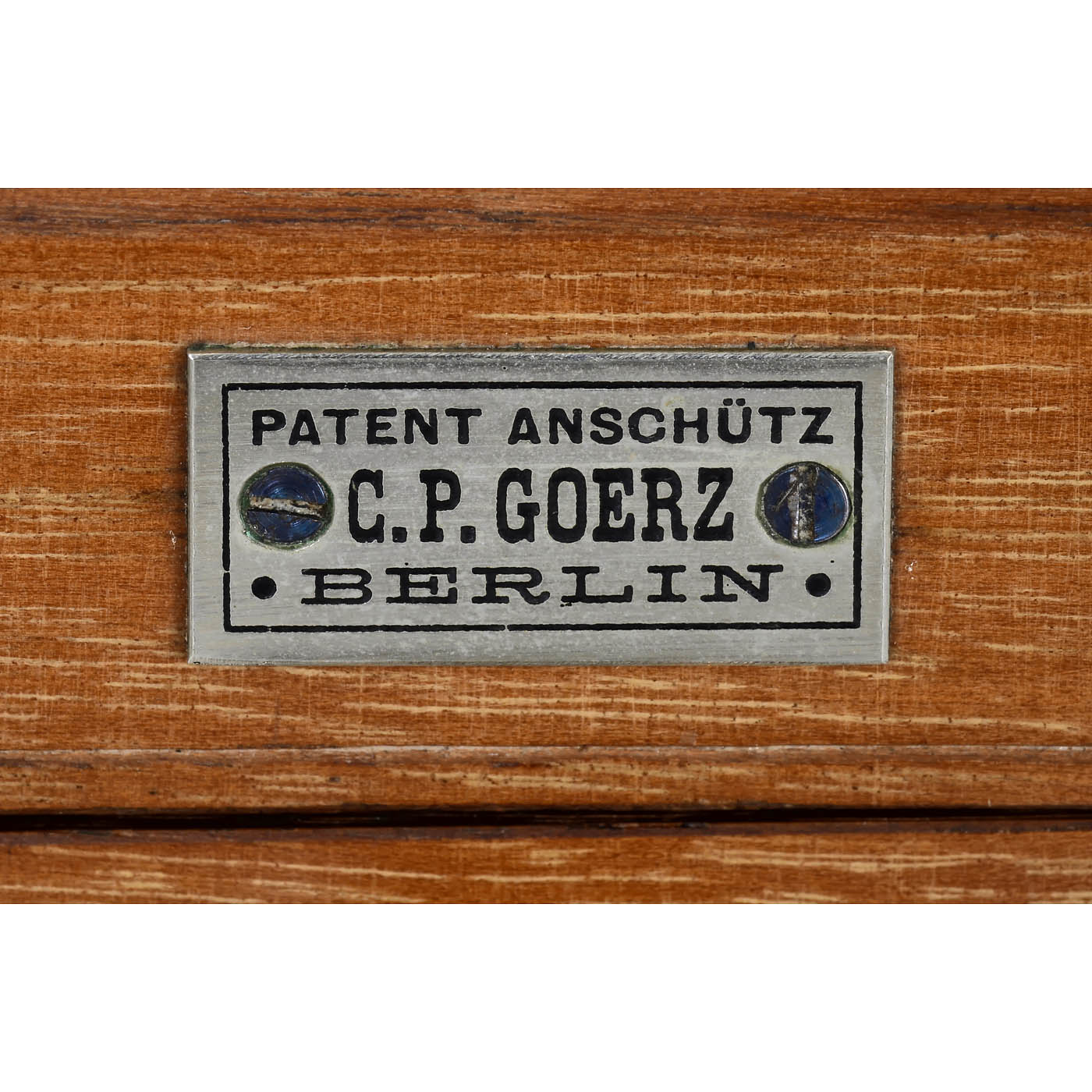 C.P. Goerz, Berlin. For plates of 9 x 12 cm, walnut with brass fittings, with original Goerz brass lens Extra-Rapid-Lynkeioskop Series C No. 1, no. 19724. Iris stop, rack-and-pinion focusing (clean optics), original brass plaque: "Patent Anschütz C.P. Goerz, Berlin", frame finder. - The first camera in the world with focal plane shutter (working well), small tension crack on front, otherwise in excellent condition! - Extremely rare milestone. - Literature: Michel Auer, "150 ans d'appareils photographiques", no. 162.