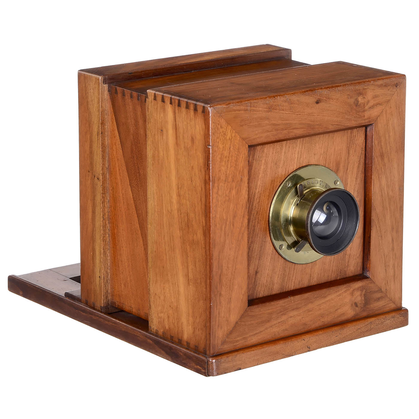 Plate size 7 x 7 in. (18 x 18 cm), inside with rotary frame 5 x 6 3/4 in., polished walnut body, camera board 11 x 15 in. focusing screen back and cassette. Body in excellent condition, interior professionally cleaned and revised, with minimal collodion stains inside. With wide-angle lens "Hémisphérique" (no. 800) by Darlot Paris.