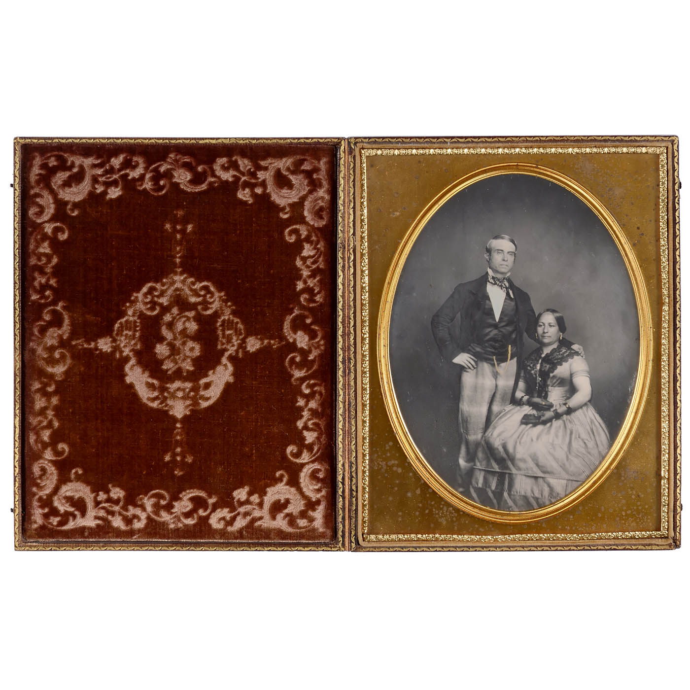Producer of the plate accredited "Charles Christofle", Parisian goldsmith (1805-1863). Christofle produced galvanoplastic products, amongst others daguerreotype plates. - Presumably self-portrait of Charles Christofle with a young lady. Original seal, whole-plate 16,2 x 21,6 cm (6 1/3 x 8 1/5 in.), fine contrast. With brass passe-partout and original case. - Museum quality!