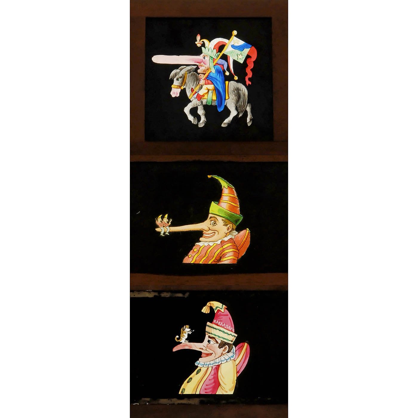 1) 3 single slipping slides "Long Nose", c. 1880, wood frame, sizes: 2 slides of 4 x 7 in. and 1 slide of 4 1/3 x 7 ½ in., 2 slides hand-painted and one slide hand-colored. (2-/2) - And: 2) 8 magic lantern slides (greeting/leave-taking), England, wood frame, sizes: 4 x 7 in. and 4 ½ x 7 in. Titles: 1 x "Welcome", 1 x "Silence", 1 x "Adieu", 1 x "Peace and Plenty", 1 x "Happy New Year" and 3 x "Good Night". One glass slightly damaged, one single slipping slide. (2-3/2)