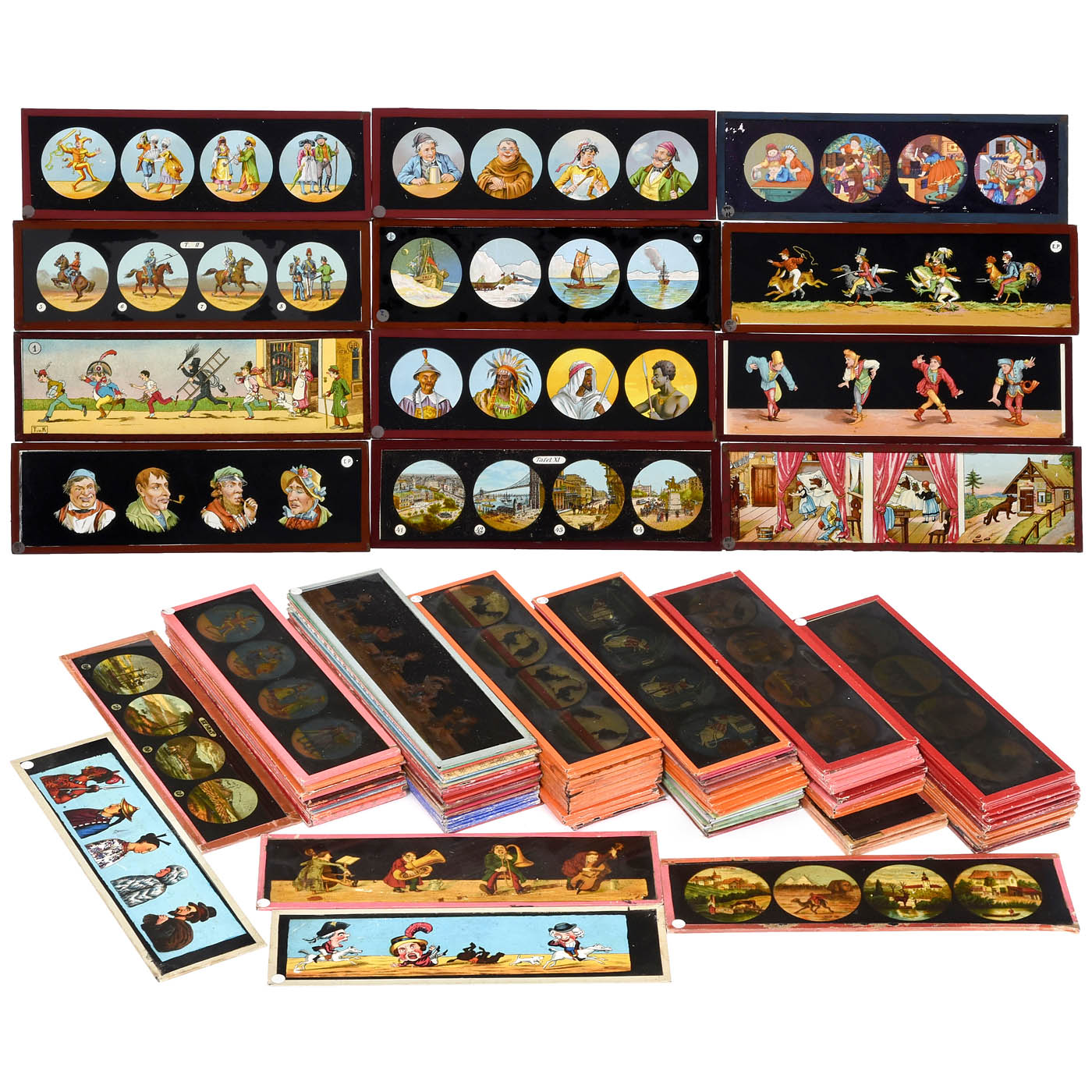 Various countries and makers, no complete series, length predominantly 8 ¾ in., panorama pictures and strip slides depicting fairy tales, comical figures, scenery, animals, soldiers and more. Some strips with minor cracks, mostly printed images.