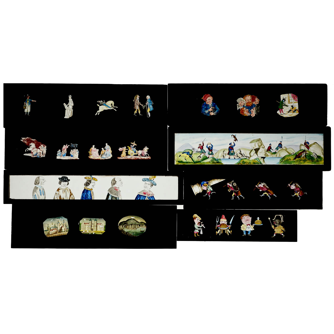 Presumably from England. 4 slides marked: "Copper Plate Slider Humourous No. 7" and "No. 13" and "Views No. 4" and "No. 5", 3 3/4 x 13 1/3 in. - 16 lantern strips 2 3/4 x 10 ¼ in., 3 1/6 x 11 4/5 in., 3 3/4 x 13 3/4 in., 4 x 14 1/5 in. (slipping slide of a departing train, glass broken), 3 x 15 in. and 3 1/5 x 10 3/5 in. (metal frame). Motifs: Humourous, comic scenes, portraits. Many slides hand-painted.