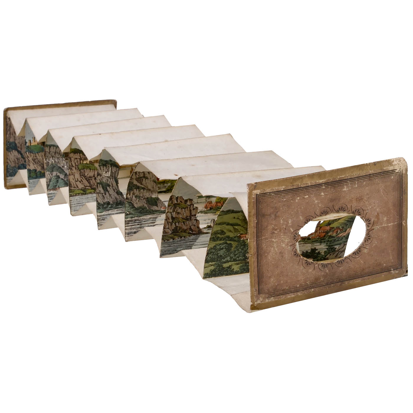 Presumably England. One panorama spyhole (Ø 2 ¾ in.), 8 sections, size 4 ¾ x 6 ¼ in., length approx. 28 ¾ in.! Hand-colored lithograph, front side and rear side with floral pattern. Motif: Topography of the Upper Rhine. - Unusual panorama perspective!