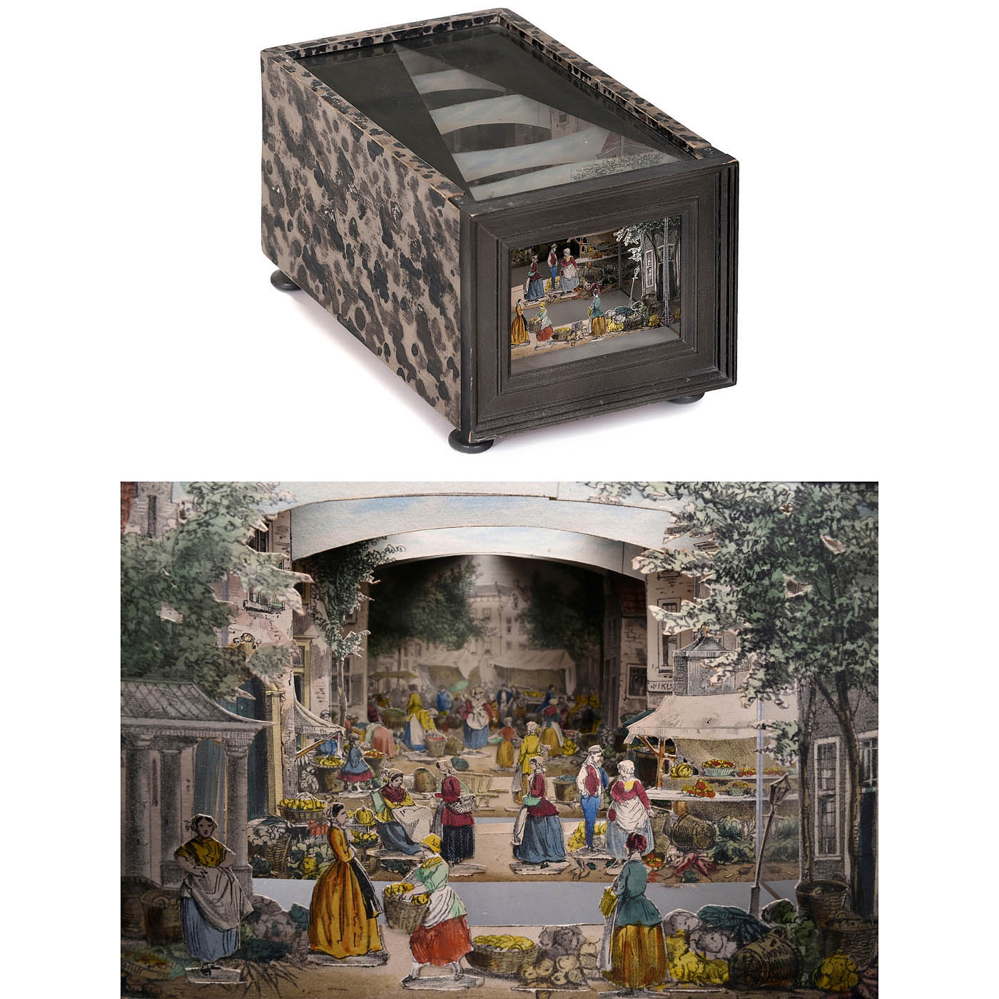 Very attractive view of a market place, wooden box with marbled pattern, 5 sections, hand-colored lithographs, glass cover, size 13 x 7 ½ x 7 in. - Attractive work of optical art!