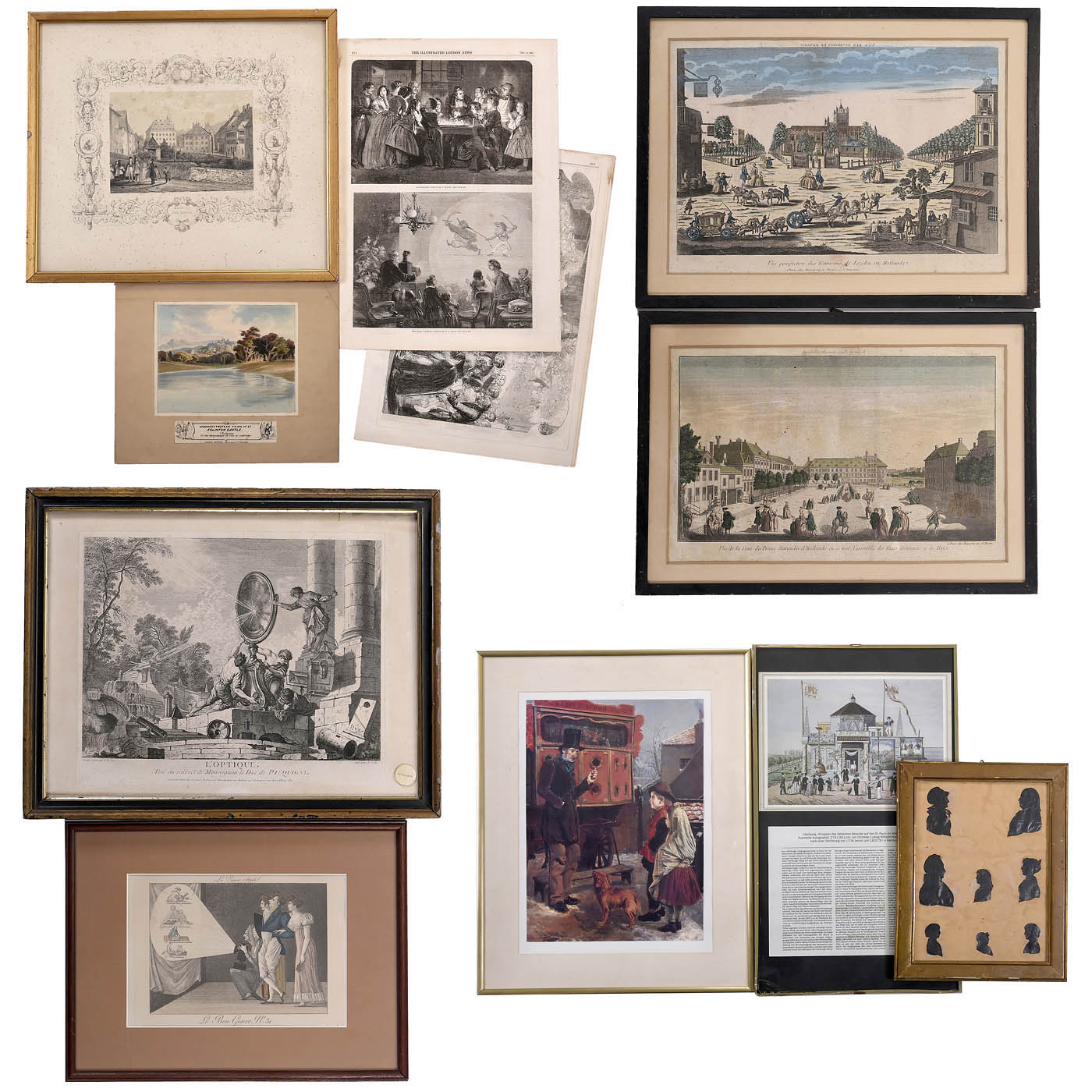 1) "L'Optique" (Tiré du Cabinet de Monseigneur le Duc de Picquigny), etching, c. 1800, size 11 ¾ x 14 1/5 in. - 2) 2 x "Vue d'Optique", c. 1780-1800, size 10 1/5 x 16 1/6 in. and 11 2/5 x 17 in. - 3) Hand-colored copper engraving "Le Vieux Style", c. 1850, size 7 ½ x 10 5/8 in. - 4) "Place du Petit Quartier", lithograph by Lith de Nicoleta Neuchâtel (Switzerland), size 13 x 15 in. - 5) Transparencies (day and night), Spooner's Protelan View No. 37, c. 1840, size 5 ½ x 7 in. - 6) "The Illustrated London News", Dec. 25, 1868 (including "The Magic Lantern - Drawn by H.G. Hine). - And: 7) Additional illustrations and prints.