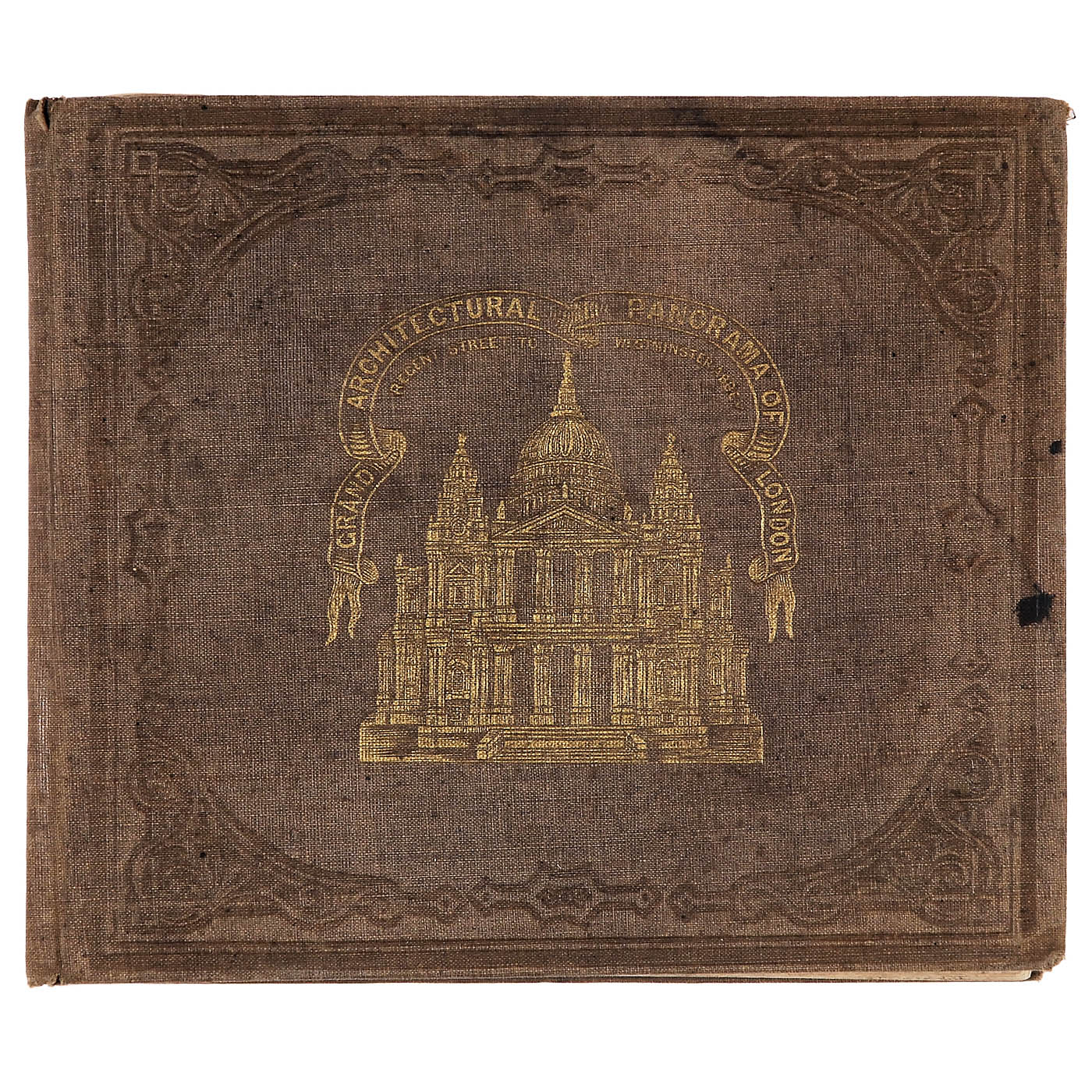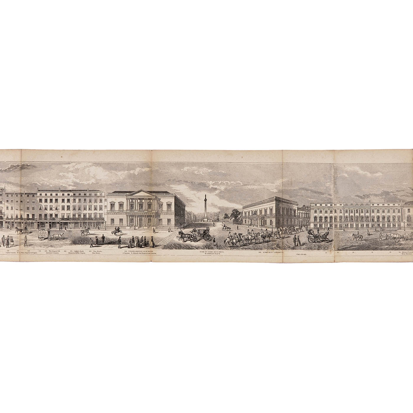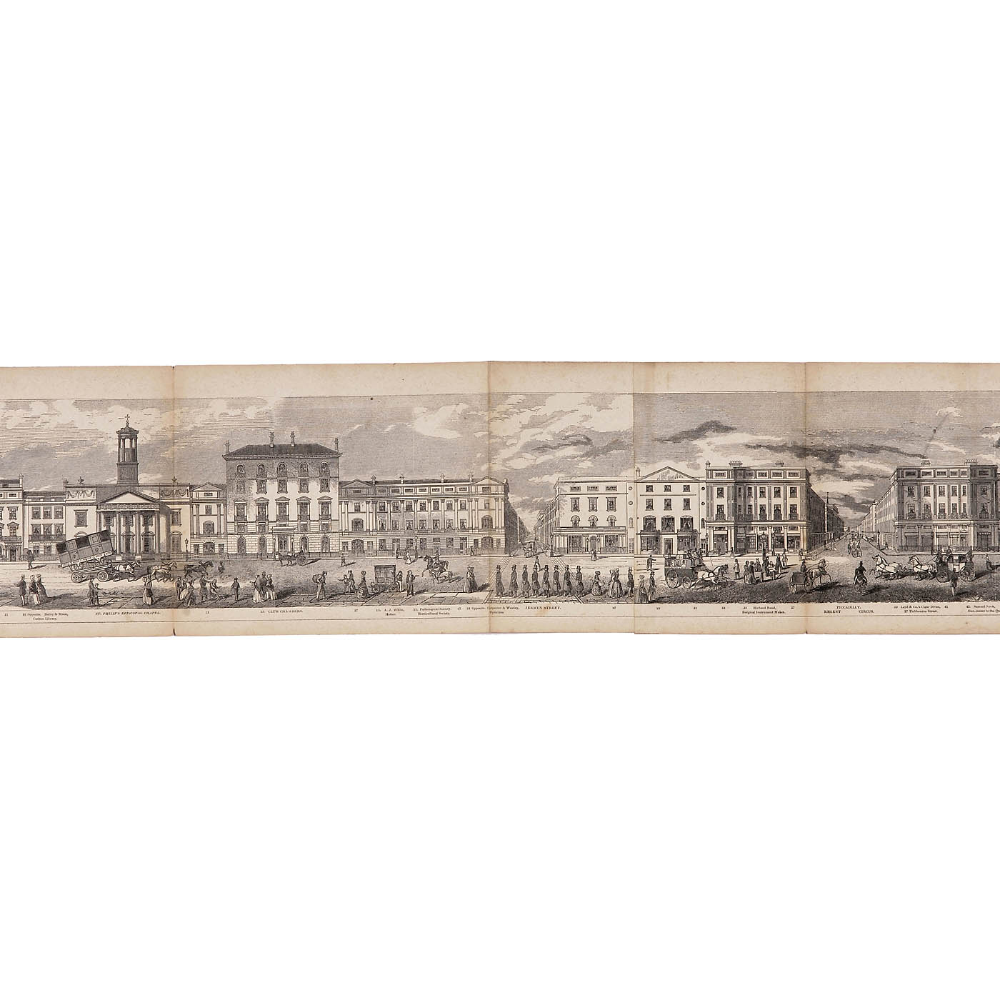 "Regent Street to Westminster Abbey", dated 1849. Sights including Royal Polytechnic Institution, Beard Daguerreotype, Kilburn Photographic Studios, Carpenter & Westley et cetera. Dimensions 6 x 270 in. (15 x 677 cm), cloth binding with gold embossing, good unrestored original condition!