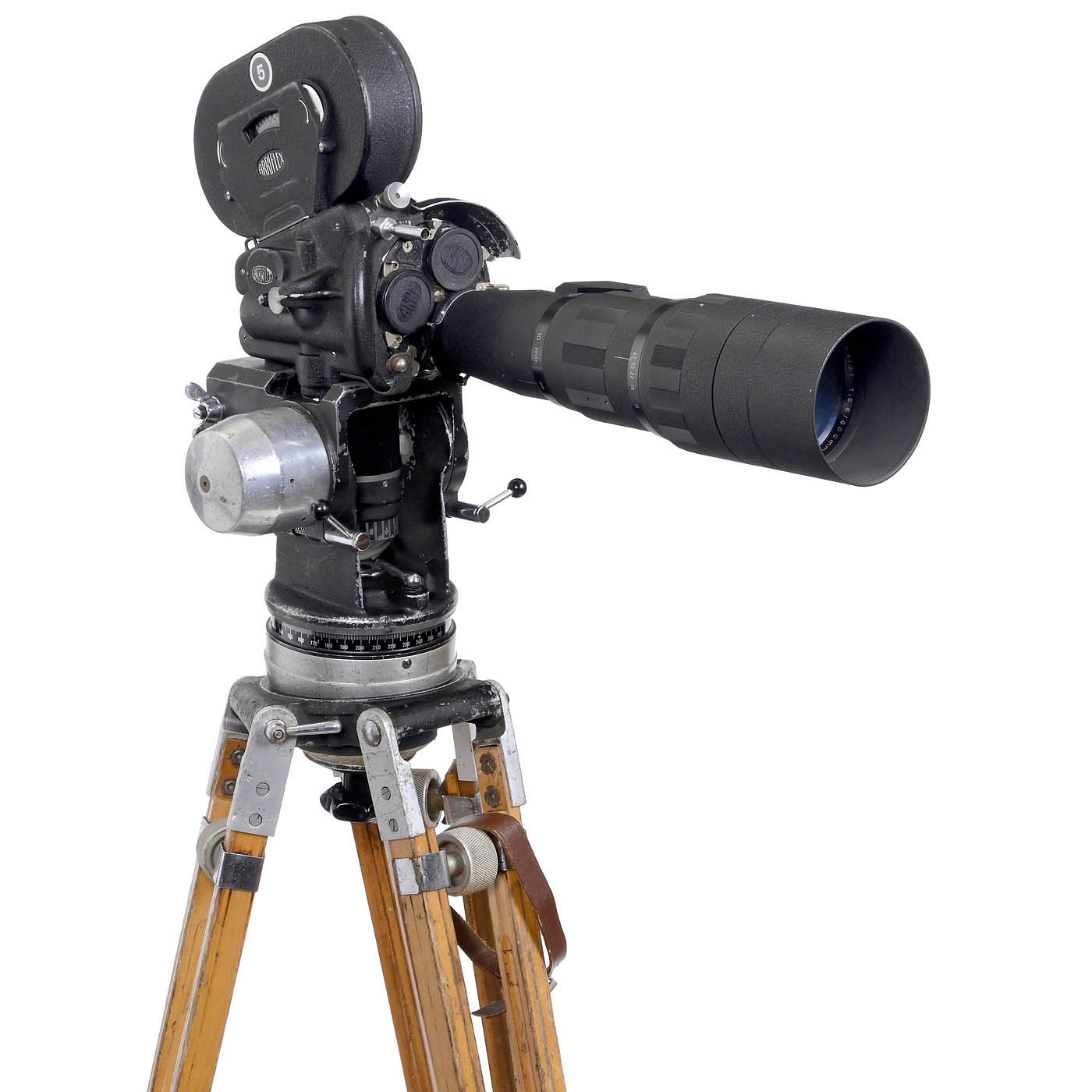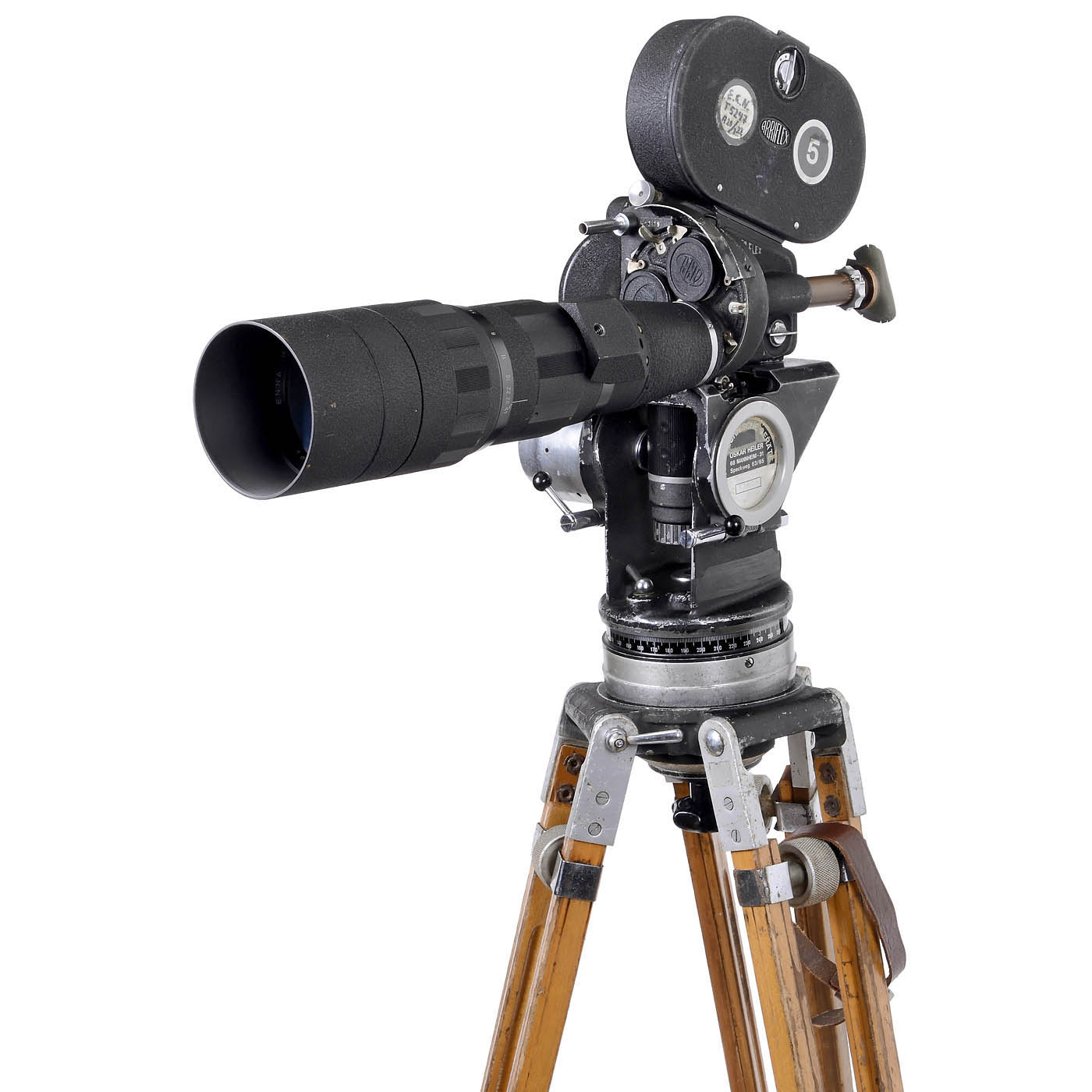 Arnold & Richter, Munich. 35mm mirror reflex camera, no. 2179, 3-lens turret, with Tele-Ennalyt, 600 mm/1:5,6, by Enna, Munich, three 60m film magazines, wooden tripod with Sachtler fluid-head (c. 1960). - In addition: Spider, pivot arm, 2 aluminum cases, replacement motor, battery pack and wires. - Electric functions untested.