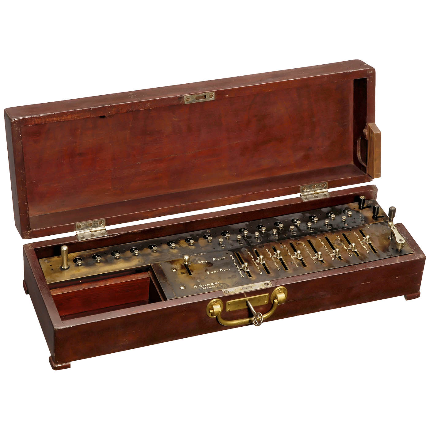 Very rare and unusual brass stepped-drum calculating machine by Bunzel Werk, Vienna/Austria. Serial no. 3669, 8, 9 and 16 digits, missing 1 revolution counter knob, working condition, in mahogany case, size 18 9/10 x 7 ¾ x 6 1/10 in. - An extraordinary collector's item!