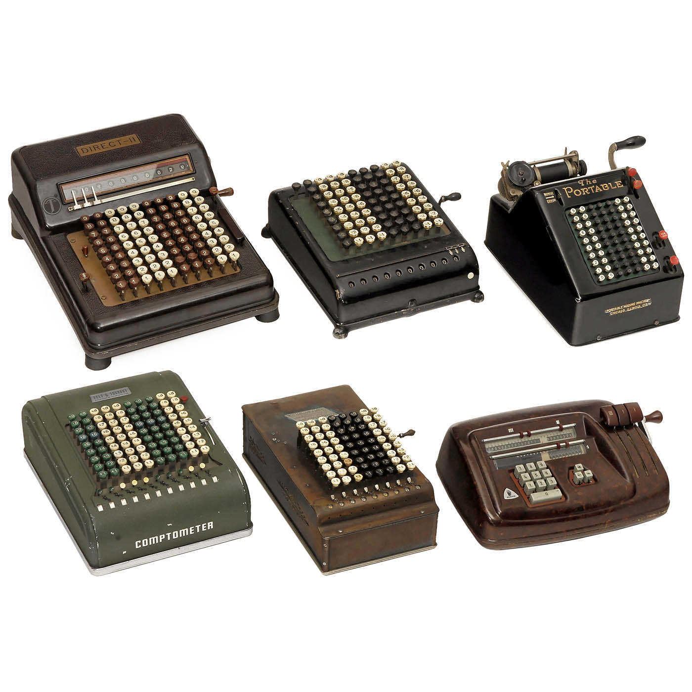 1) Brunsviga, ten keys, bakelite case, mechanism sticks. - 2) The Portable, with printer, Chicago, working. - 3) Comptometer, USA, 10 key rows, working. - 4) Comptometer, USA, 8 key rows, mechanism sticks slightly. - 5) Unmarked, USA, 9 key rows, working. - And: 6) Direct II, Moesch & Huber, Switzerland, 10 key rows, bakelite case, mechanism sticks.