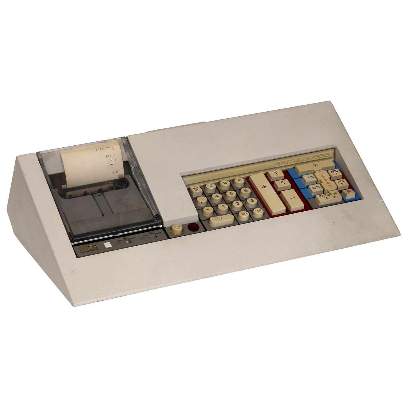 Italy, Texas Instruments TMC1828 mains processor, four basic arithmetic operations, internal plain-paper impact printer, exterior design by Mario Bellini, another example is in the Museum of Modern Art (MOMA) in New York.
