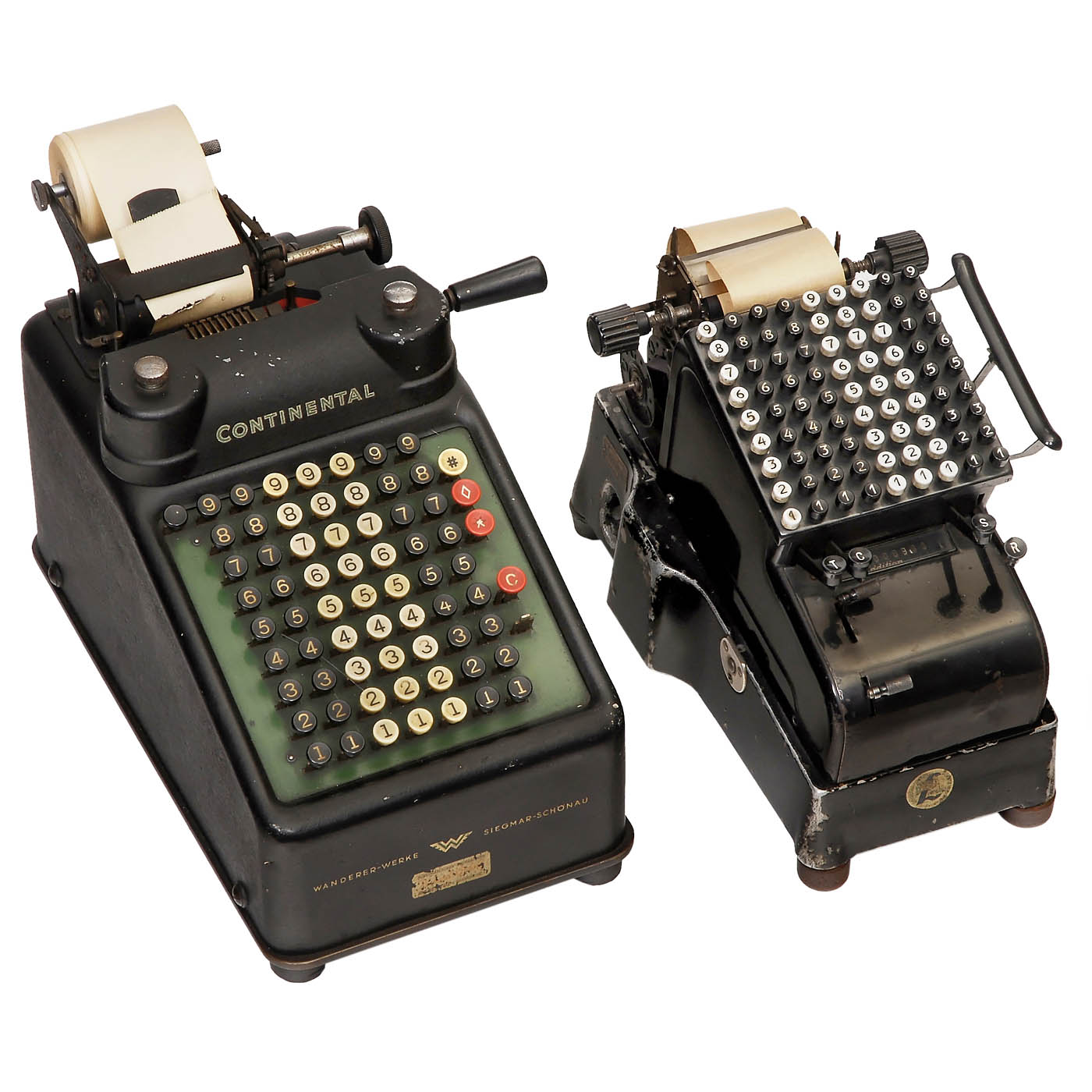 1) "Tasma Mod. C", serial no. 600, adding machine made by Tasma-Addiermaschinen, Berlin-Lichterfeld, Germany. Full-keyboard miniature adding machine, visible printing, electric. (3/-). And: 2) "Continental Modell 8", Wanderer-Werke, mechanical, visible printing, missing 1 keytop. (3/3)