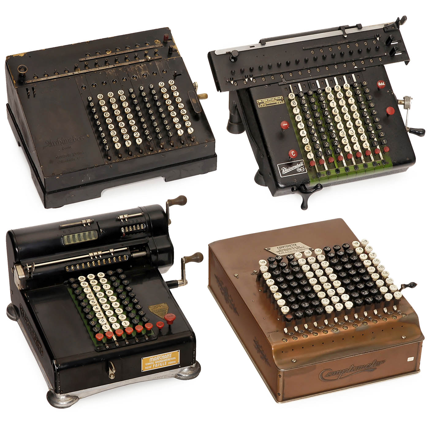 1) Comptometer, 12-digit adder with copper-tin case, working, c. 1935. - 2) Marchant model H6, stylish Californian adapting segment calculator with 6, 6 and 12 digits, working, c. 1935. - 3) Rheinmetall model Ie, stepped-drum calculator, 9, 8 and 17 digits, working, c. 1930. - And: 4) Archimedes model D, German stepped-drum calculating machine by Reinhold Pöthig, Glashütte, Saxony, 9, 8 and 13 digits, mechanism sticks, c. 1915.