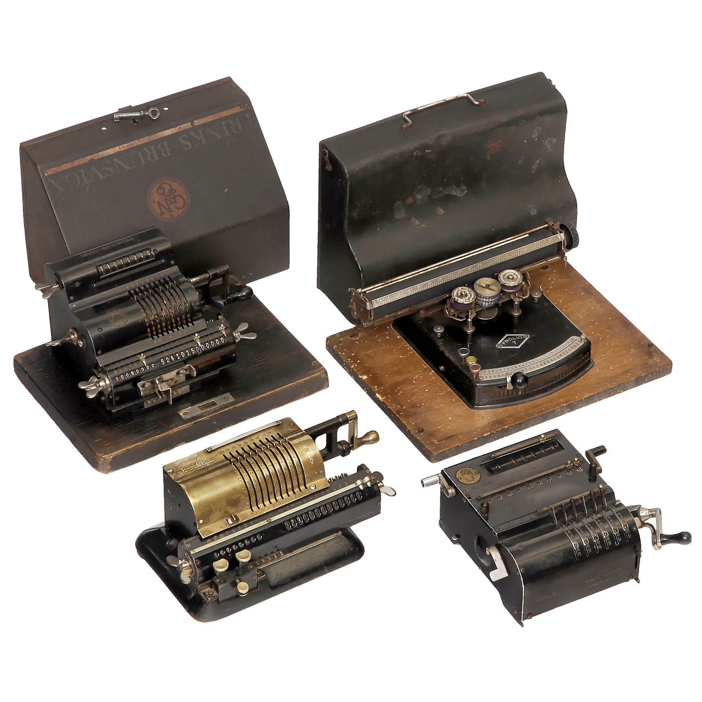 1) Trinks-Brunsviga, Grimme, Natalis & Co., Braunschweig. 9, 8 and 13 digits. With tin cover. (3/2) - 2) Original-Odhner, 10, 8 and 13 digits. (3/4) - 3) Brunsviga model 10, Grimme, Natalis & Co., Braunschweig. 6, 5 and 10 digits. (3/2) - And: 4) Frolio 7, German typewheel machine with tin cover. (3/3)