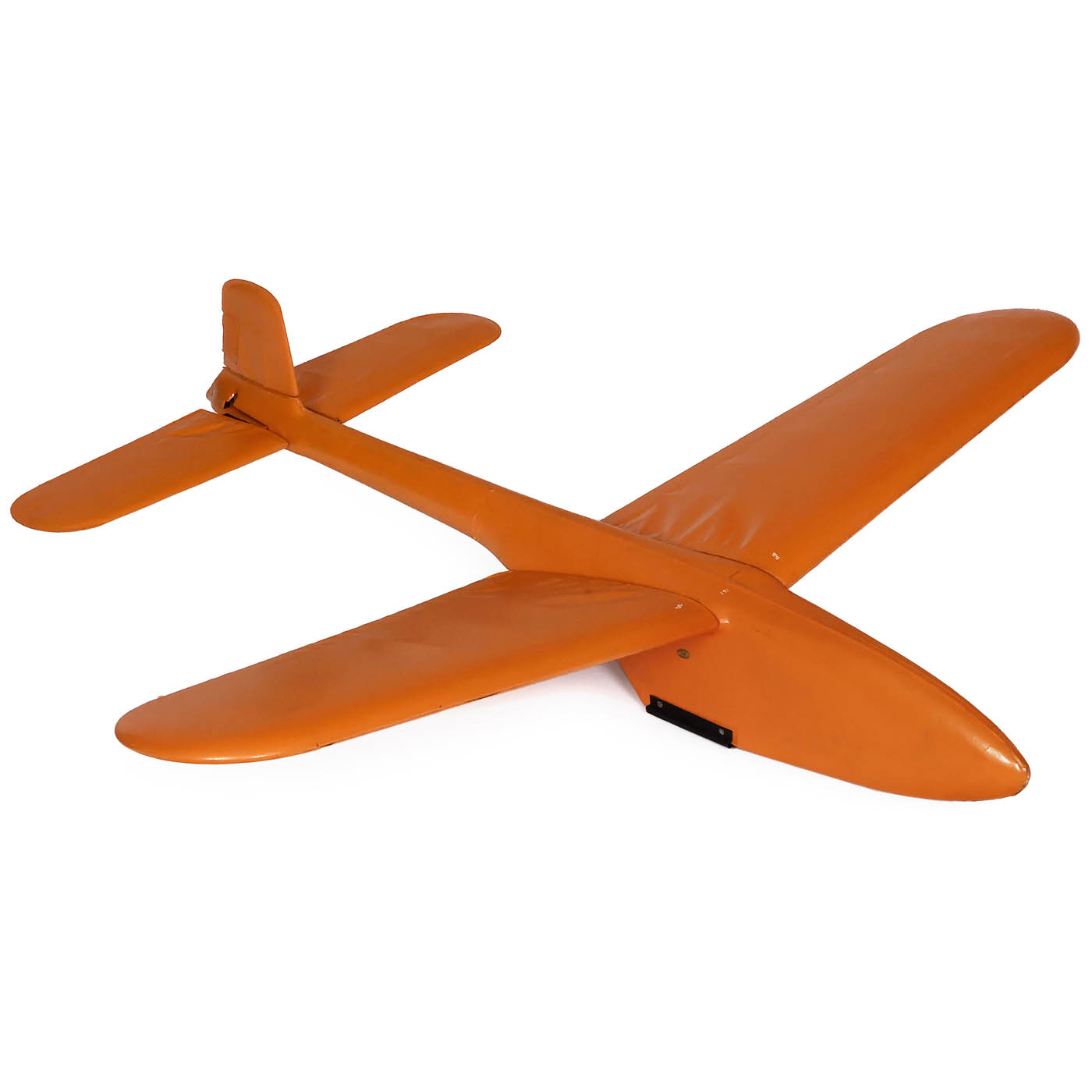 A rare Second World War period rocket-powered model of wood construction, built by the International Model Co Ltd of Merton, South West London, finished in all-over high visibility orange with maker's label and notice "Finder please take to Police Station", 46 in. (117 cm) wingspan, dismantled, in original card case 43 x 11 x 6 in. (109 x 28 x 15 cm).