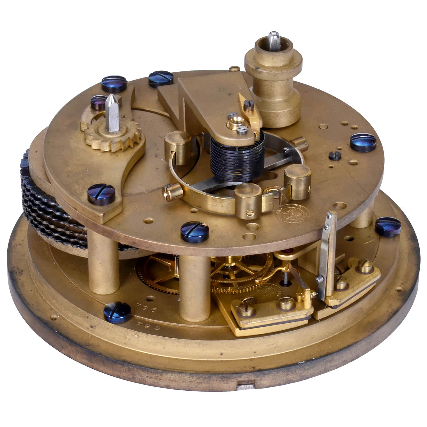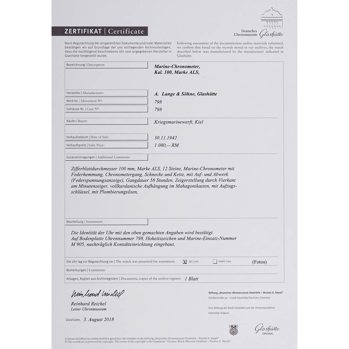 A. Lange & Söhne, Glashütte. No. 798, caliber 100, 12 jeweled endstones, fusee movement, subsidiary seconds and up-and-down dials for 56 hours, swastika and marine No. M905 on the bedplate, gimbal-mounted in two-tier mahogany case. This clock was delivered to the Kriegsmarine shipyard in Kiel on 30.11.1942. Only 113 marine chronometers caliber 100 were made. - Working. With certificate.