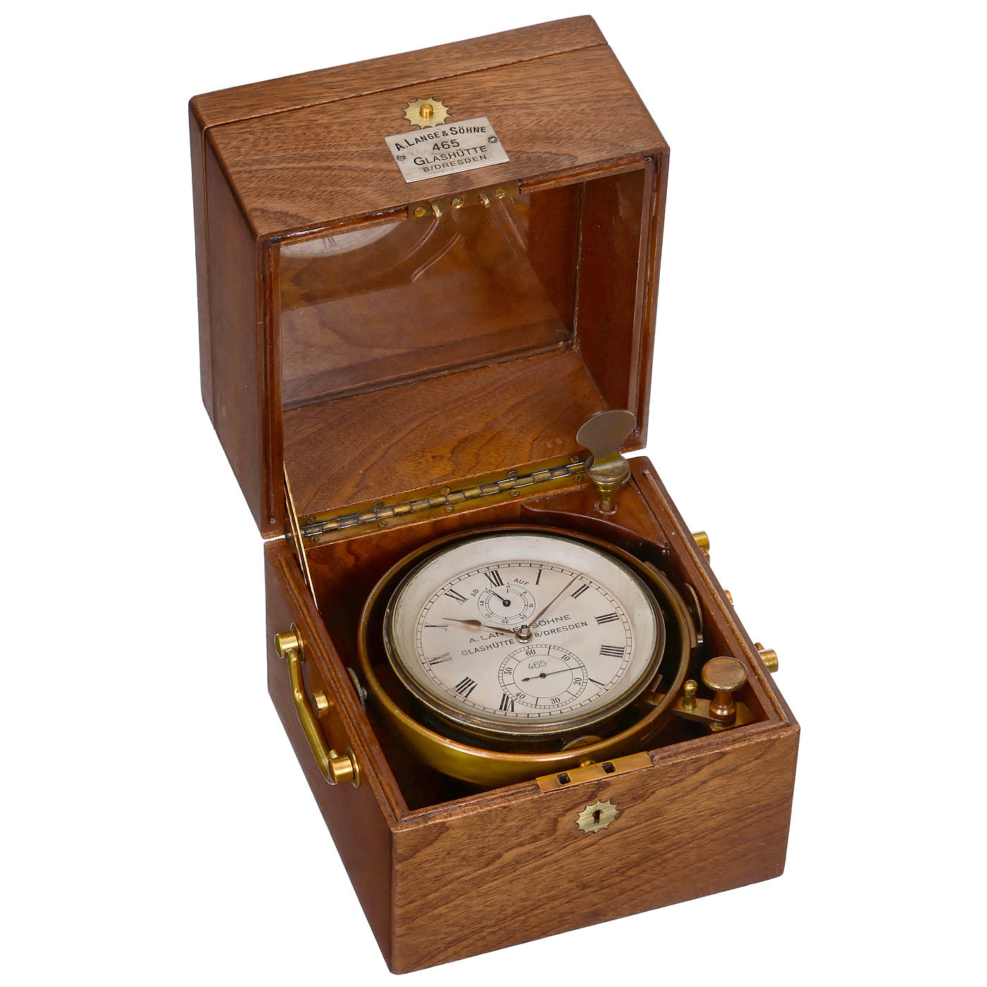 A. Lange & Söhne, Glashütte. No. 465, sidereal time adjustment, caliber 100, 12 jeweled endstones, fusee movement, subsidiary seconds and up-and-down dials for 56 hours, gimbal-mounted in three-tier mahogany case. Very rare, only 46 chronometers with this regulation were made by Lange & Söhne. This number 465 was delivered 1923 to the USSR board of trade. Working.