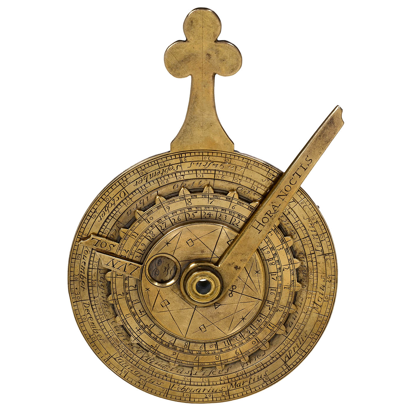 Circular brass instrument, with Latin inscriptions, face with 2 discs and indicator arm, outer disc with engraved months, inner disc with hours of the day, pointers engraved with "Hora Noctis", "Lun" and "Sol", reverse with another indicator arm, with engravings for the latitude and "Horae Pomeridianae", "Horae Antemeridianae" and "IV. fac Coloniae", Ø 3 1/6 in. - An early replica, in good condition.