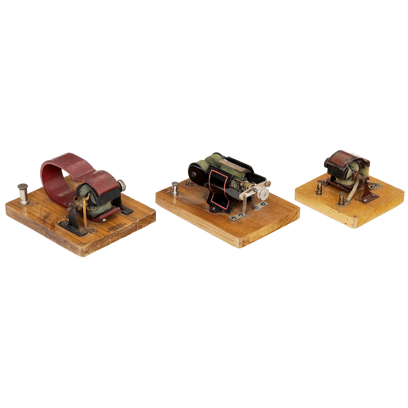 Low-current self-starting toy motors with triple T-anchors, mounted on polished wood bases. 1) Gebrüder Bing, Nuremberg. - 2) Unmarked. - And: 3) Hirsch, Paris.