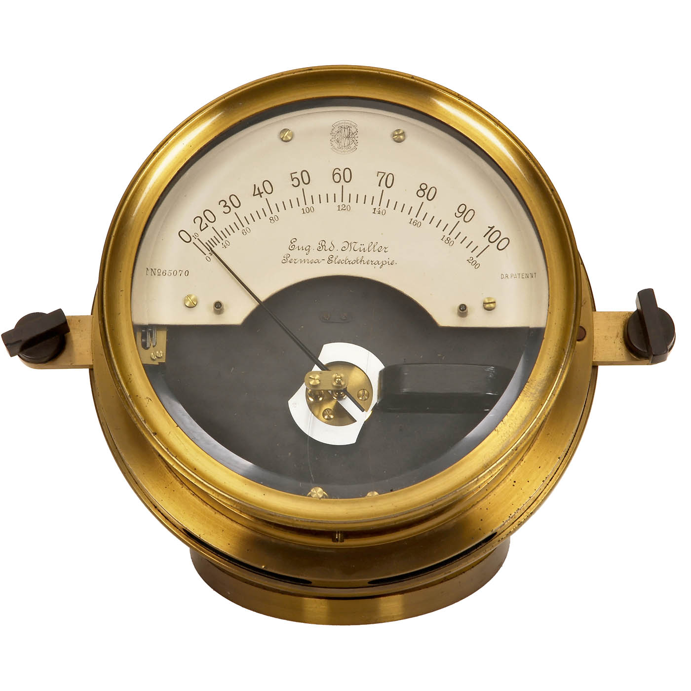 Used in permea-electrotherapy, Eug. Rd. Müller, DRP, up to 100 ampere, original lacquered brass, Ø 8 ¾ in., on brass base.