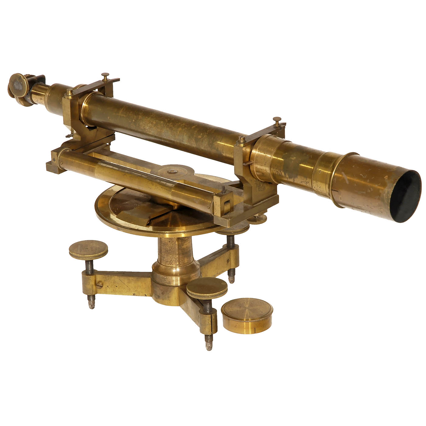 Signed: "Brosset Fre.s, 22, R. des Francs Bourgeois, Paris", original lacquered brass, 1 bubble-level, detachable 19 5/8 in. telescope with rack-and-pinion focusing, on tripod mount with 3 adjustable screw feet, overall height 10 1/5 in., in matching wood case with serial no. 31576.