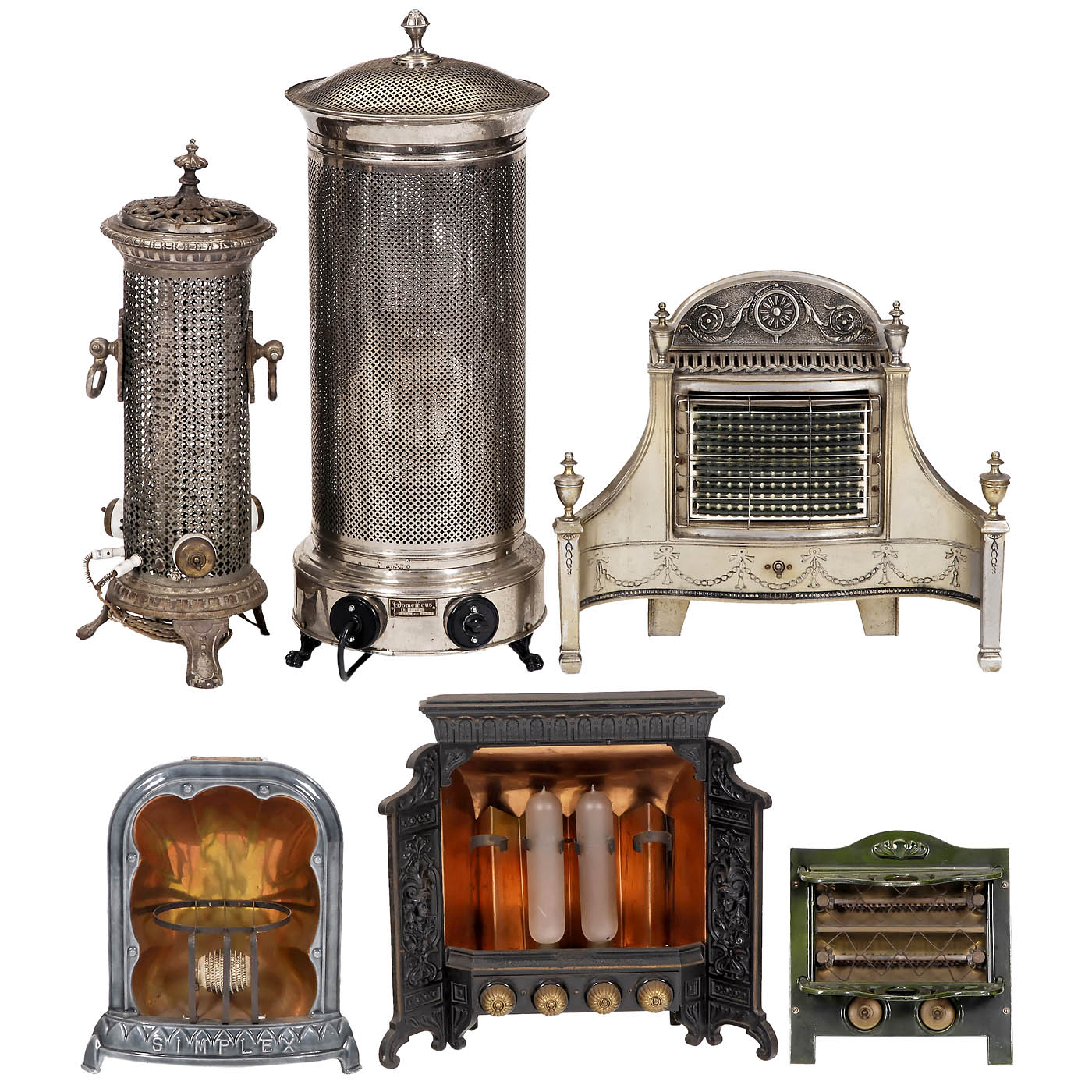 1) Prometheus, nickel-plated metal, 220 V, height 34 ¾ in. - 2) Unmarked, nickel-plated metal, height 28 in. - 3) Belling & Co., England. 230 V, nickel-plated cast-metal, height 20 in. - 4) The Dowsing Radiant Heat Co., London. Cast-metal, with 2 of 4 heating bulbs, height 22 ½ in. - 5) Iventa, enameled, with 2 racks for water or tea kettle, height 14 ½ in. - And: 6) Simplex, enameled, height 19 1/3 in.
