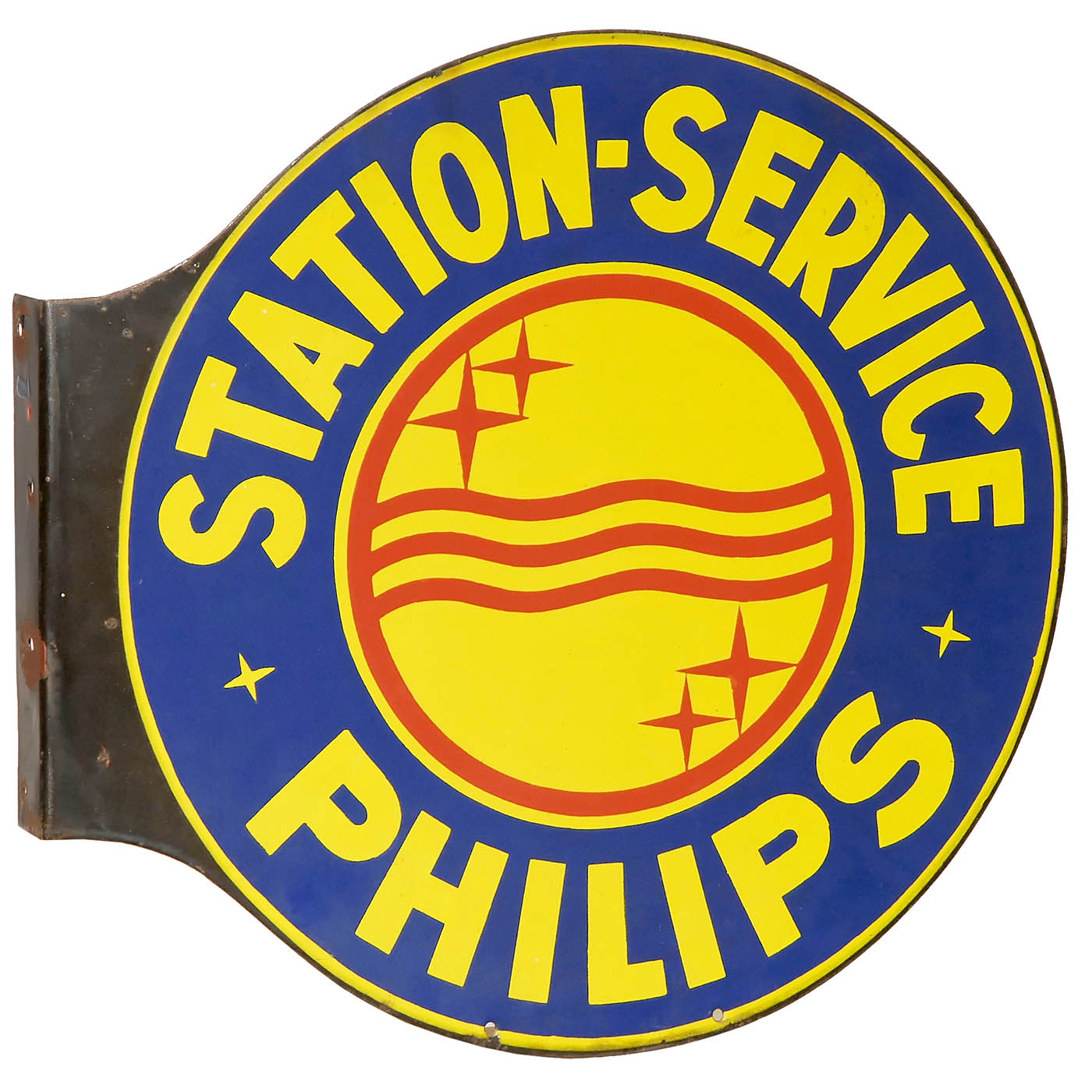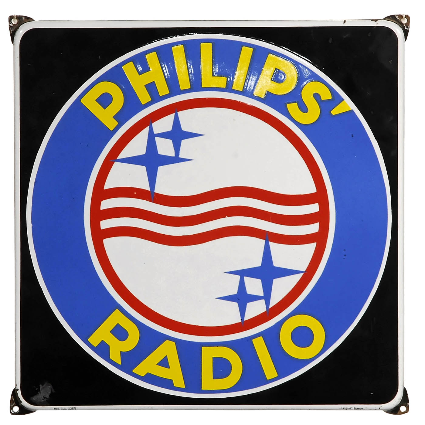 1) "Philips TSF", double-sided, 25 3/5 x 18 7/8 in. - 2) "Philips Radio", 13 1/3 x 13 1/3 in. - And: 3) "Philips Station-Service", double-sided, Ø 21 ¼ in.
