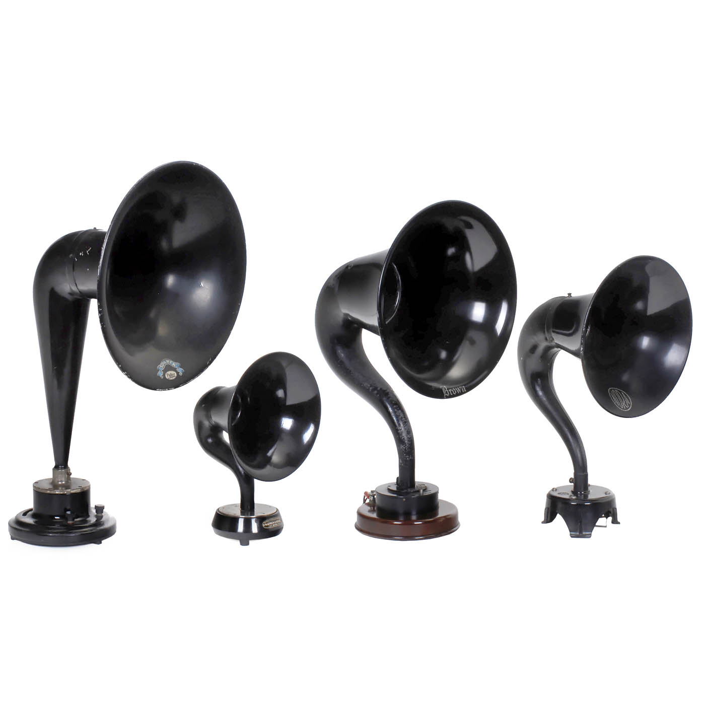 1) Brown H1, GB, 4000 ohms, height 21 in., 1924. - 2) Nora L11, Germany, 2000 ohms, height 19 in., 1928. - 3) Fuller Sparta HHA, GB, 4000 ohms, height 24 ¼ in., 1925. - And: 4) Kapsch & Söhne, Vienna. Height 12 ½ in., 1926.