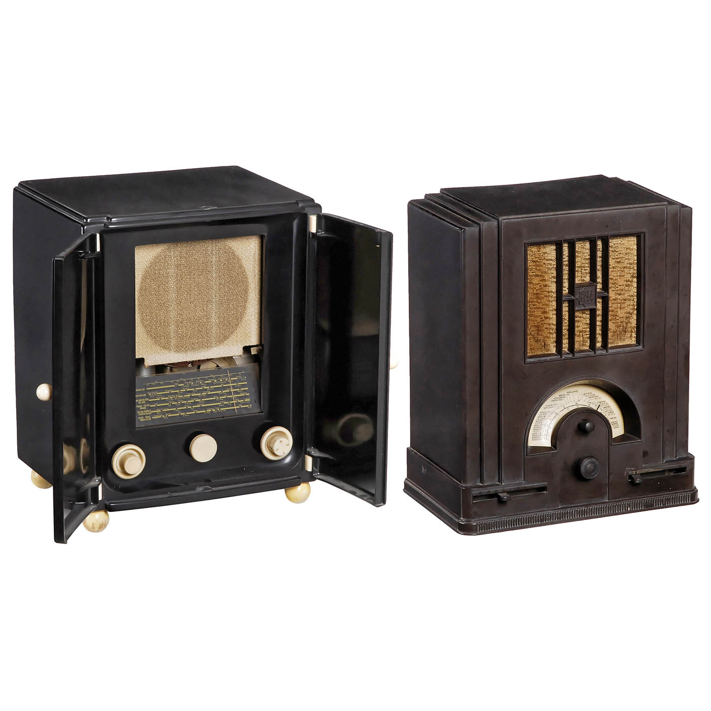 1) Siemens Schatulle 53WL, the so-called "Dinner Jacket", bakelite case, 2 opening doors, 3 tubes, mains-operated, broadcast and LW, central front panel part missing, otherwise complete with all components and rear panel, 1935. - And: 2) Telefunken Wiking 125WLK, 3 tubes, 3 wave ranges, AC 110-240 V, bakelite case, complete with all components and rear panel, 1933.