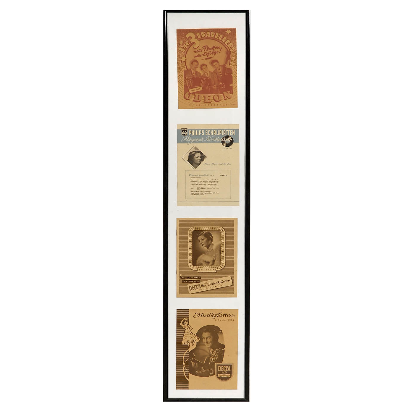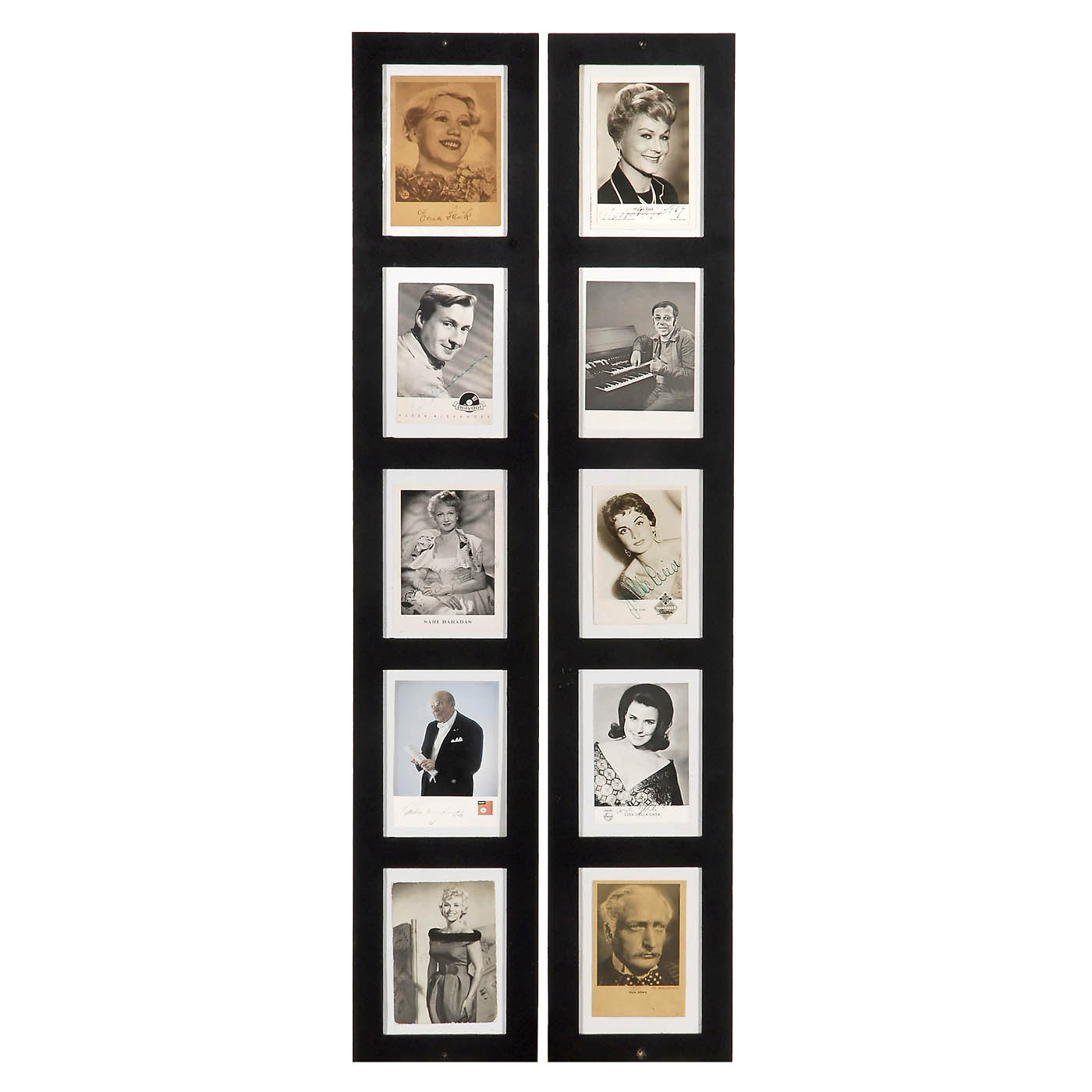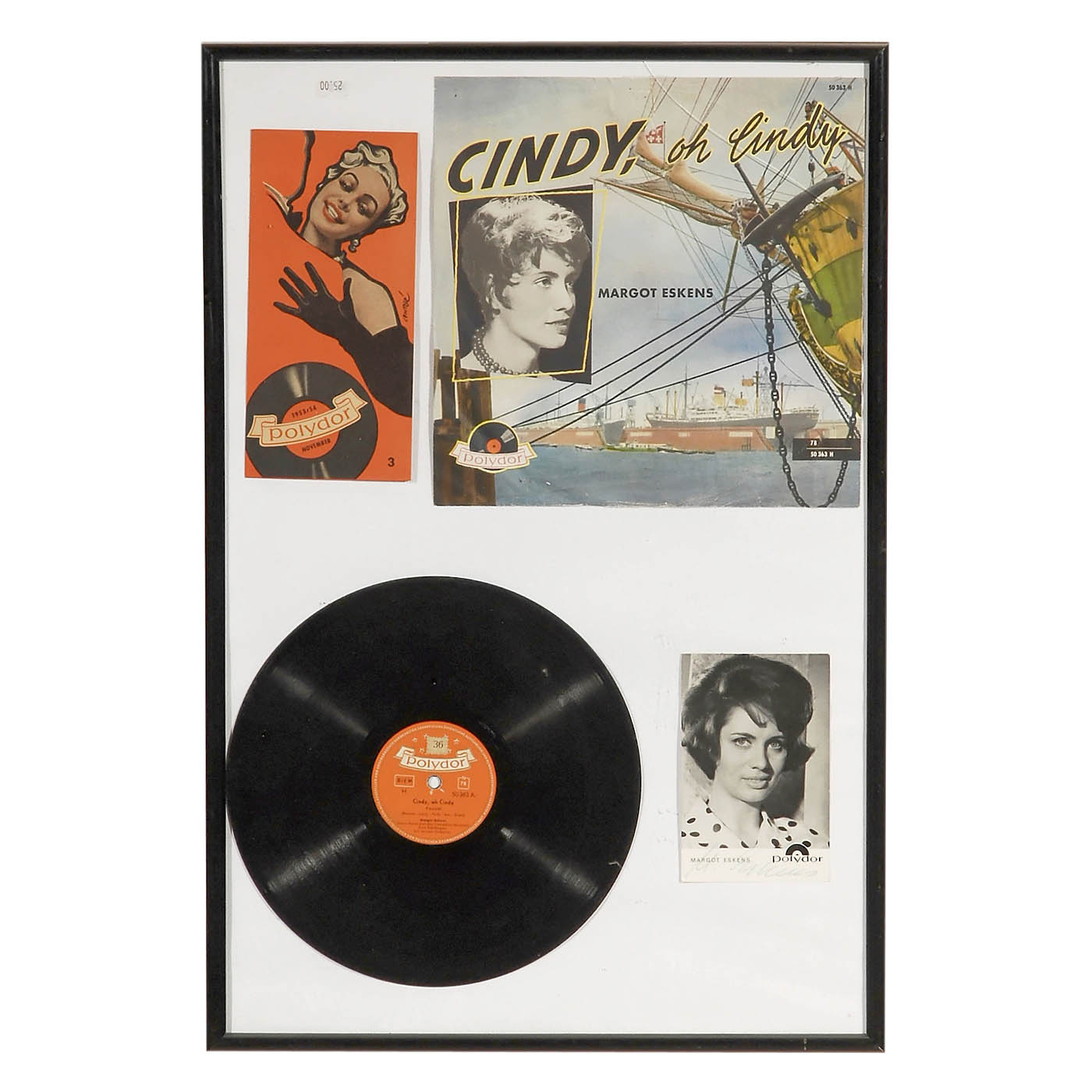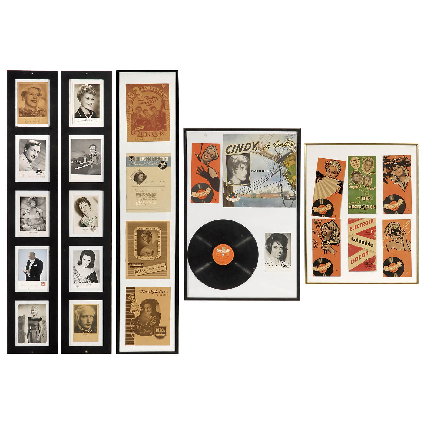 1) 10 program booklets: Odeon, Decca, Philips, Austroton and Polydor, framed, 15 ¾ x 19 5/8 in. and 8 ¼ x 39 ¾ in. - 2) Margot Eskens: "Cindy, oh Cindy", program booklet, disc and signed card, 16 1/6 x 24 in.. - And: 3) 10 German and international artists postcards, some signed, in 2 frames, 7 x 44 ½ in. each.