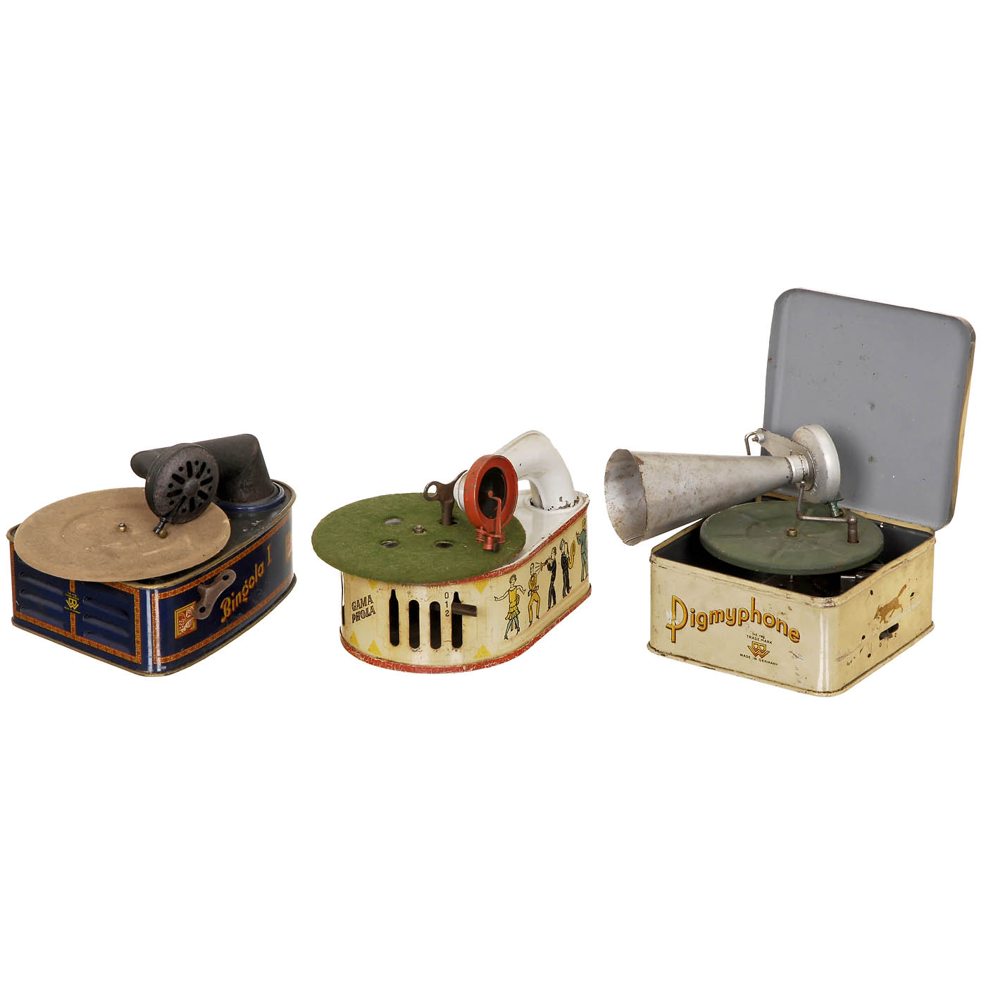 Lithographed tin, spring-driven. 1) Gama Phola, Georg Adam Mangold, Nuremberg. 2) Pigmyphone, Bing Werke. - And: 3) Bingola I, Bing Werke. - All gramophones are working, with 3 discs.
