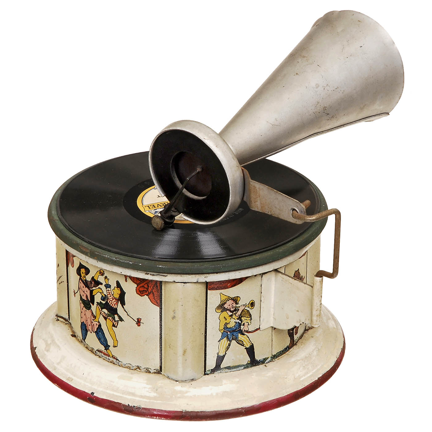 Bing Werke in Nuremberg. Lithographed tin. 1) Kiddyphone. - And: 2) Valora. - Both gramophones are working, with 2 discs.