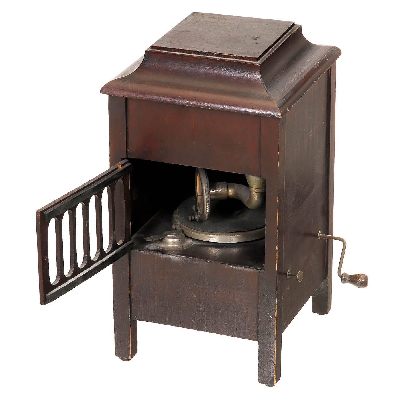 Toy gramophone, unmarked, mica reproducer, for 6 in. discs, mahogany-grained wood case, height only 16 ½ in., working.