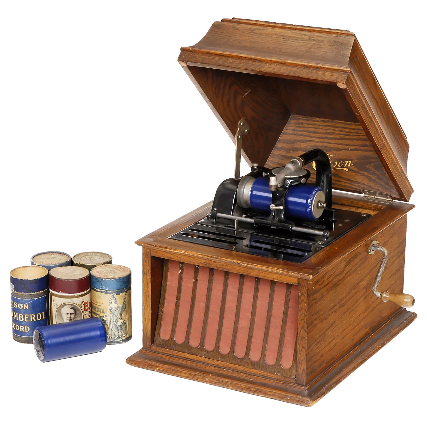 4-minute model, Diamond C reproducer, oak case, working. One of the smallest table-top Amberolas. Good playing condition, with 3 Blue Amberol Records and 3 further cylinders.
