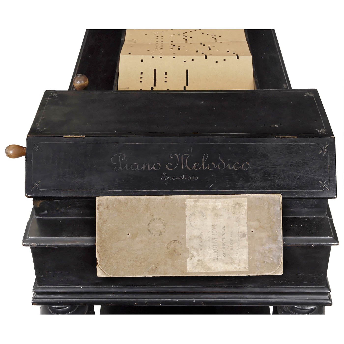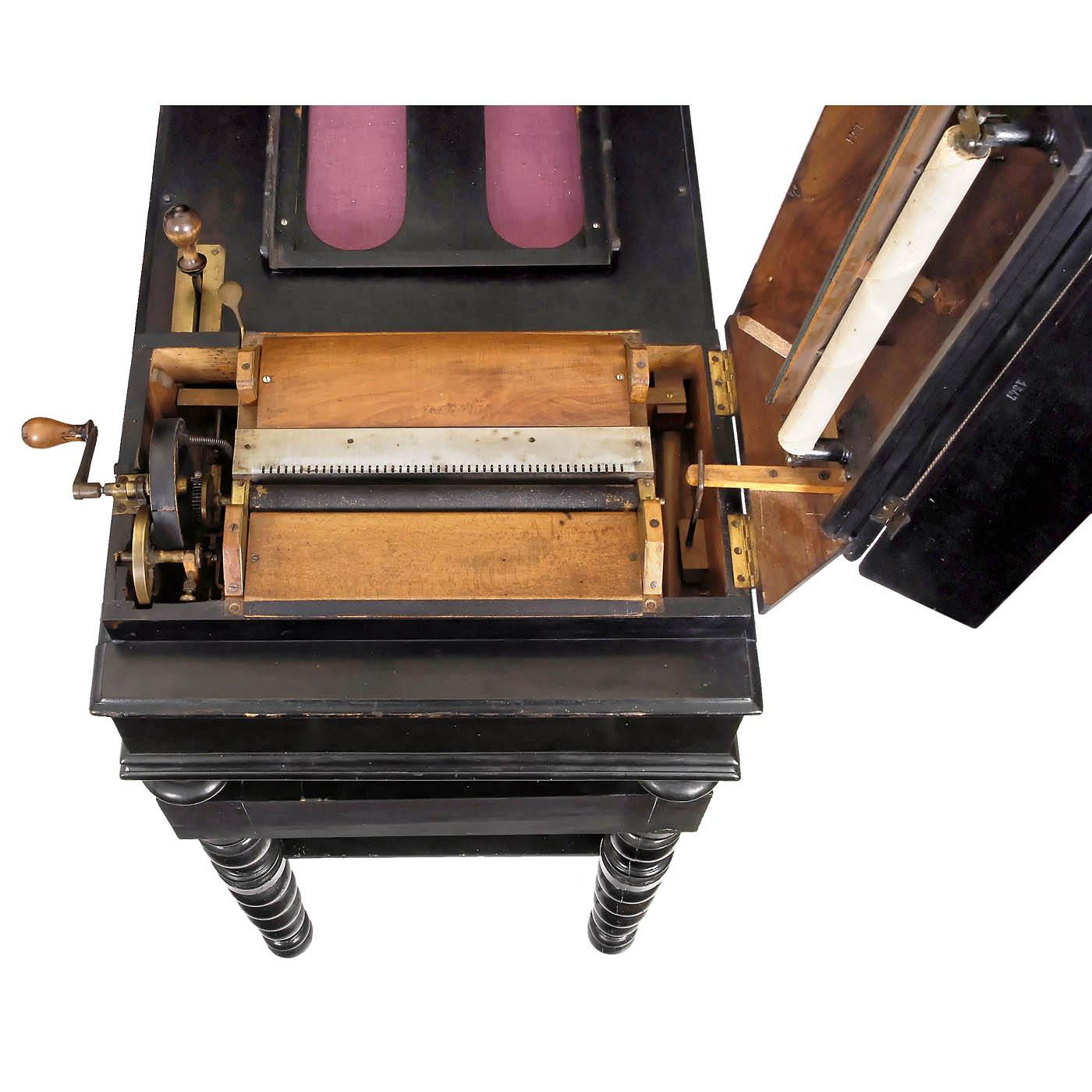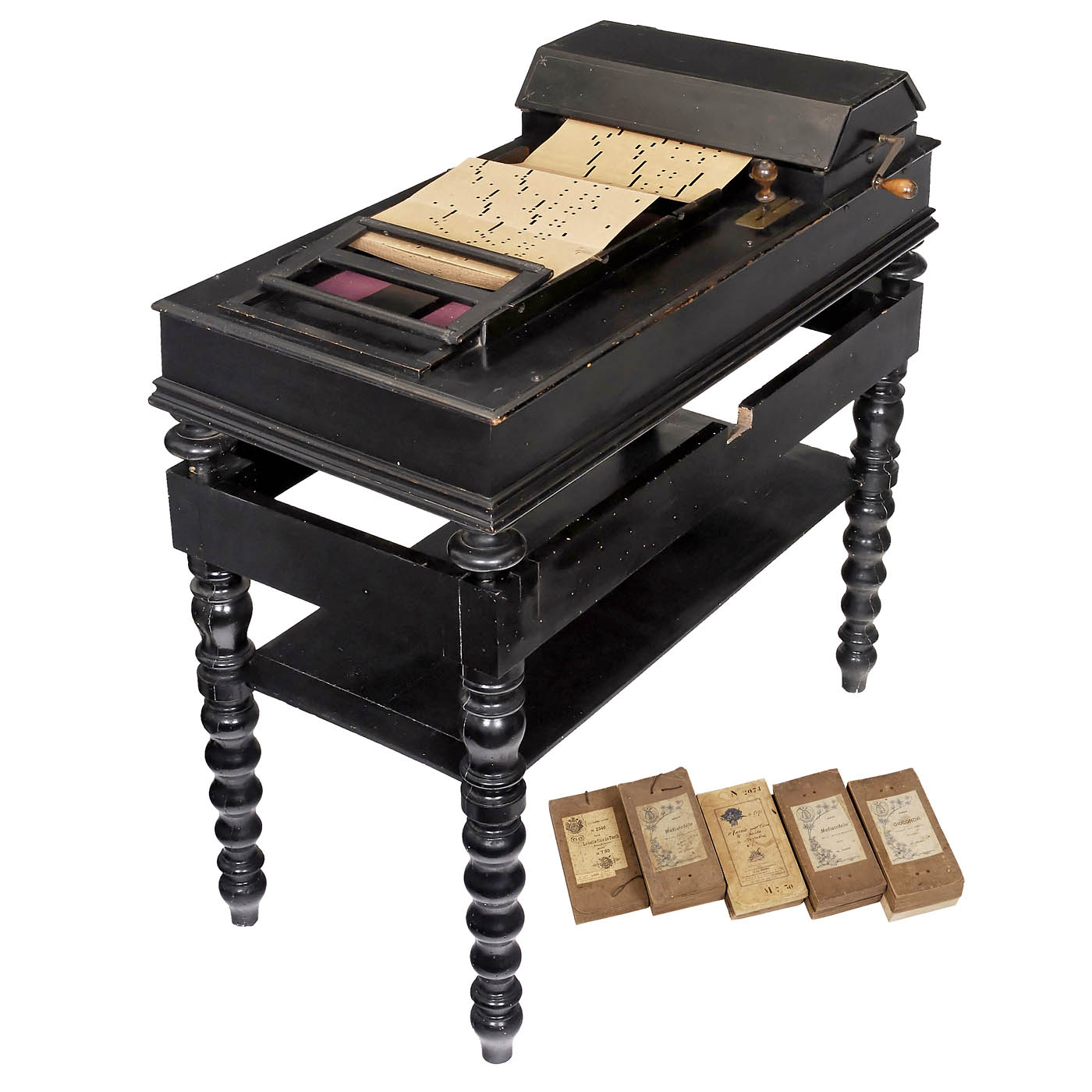 No. 1547, manufactured by "Giovanni Racca", Bologna, Italy, for folding cardboard books, hand-cranked, steel-strings, expression lever, metal frame, black polished wood case, on matching table, overall size 43 x 21 x 44 in., good working condition. With 9 books.