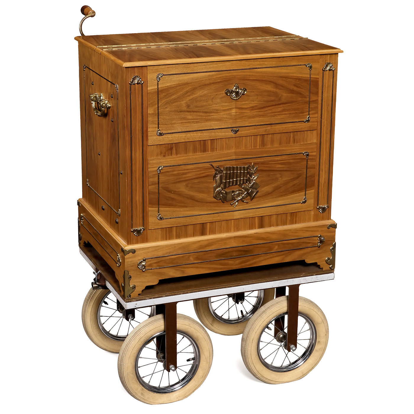 Franz Oehrlein, Mainz (1932-2013). Hand-cranked organ with book-playing action on 33 notes, accompanied by automaton scene of a village fête in the Tessin canton, with articulated carved and painted wood figures of band, 3 dancing couples and children on a see-saw, in walnut-veneered case with maker's plaque, brass beading and decoration, on cart, dimensions including cart: 28 x 20 x 44 in. (71 x 53 x 112 cm). With crank and approx. 750 meters of book music. Excellent working and playing condition!