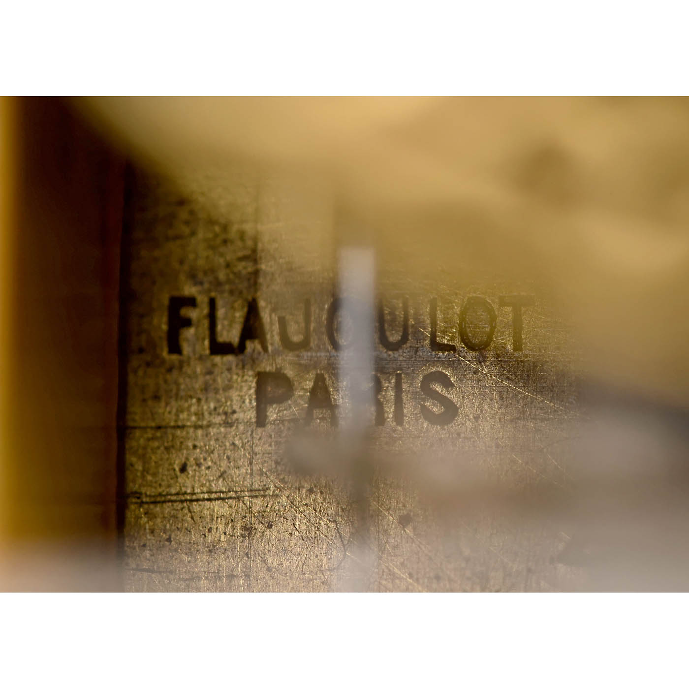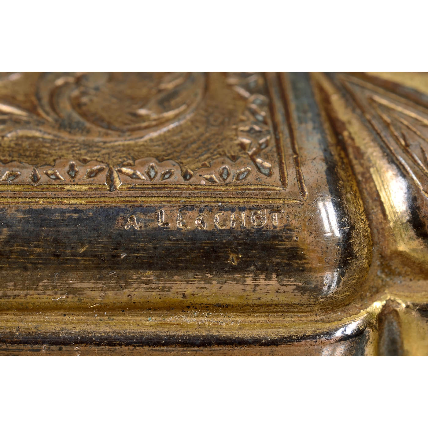 No. 1042, with going-barrel movement stamped "Flajoulot, Paris", whistle and bellows, bird with iridescent plumage, articulated bone beak, wings, tail and swiveling perch, in gilt-metal case with scalloped corners and intricate cast designs of garlands and baskets on a matted ground, the oval lid with motifs of torch and quiver flanked on case lid by sylph-like figures bearing fruit and wine, the case stamped "A. Leschot", wd. 3 ¾ in. (9,5 cm), gilding worn, bird missing one eye and wing feathers, solder repairs on air-brake, working condition but running too fast.