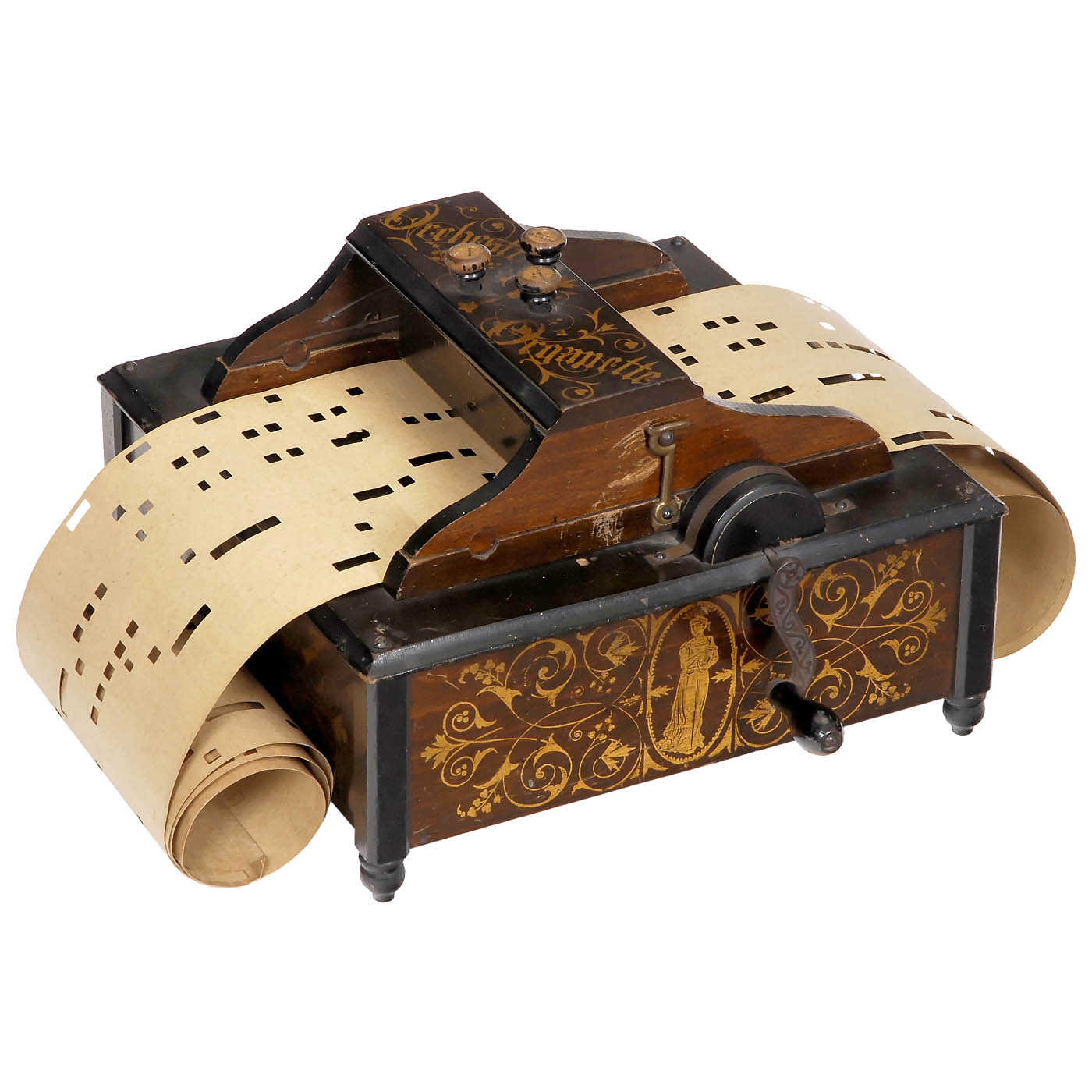 1) Orchestral Organette, made by J.M. Draper, England. 14 notes, for paper strips, plays too softly. With 9 paper strips. (3/4) - And: 2) Diana, by Phönix Musikwerke, Leipzig. Hand-organ with 14 accordion steel-tongues and zinc-discs, good playing condition, with 24 discs. (3/2-3)