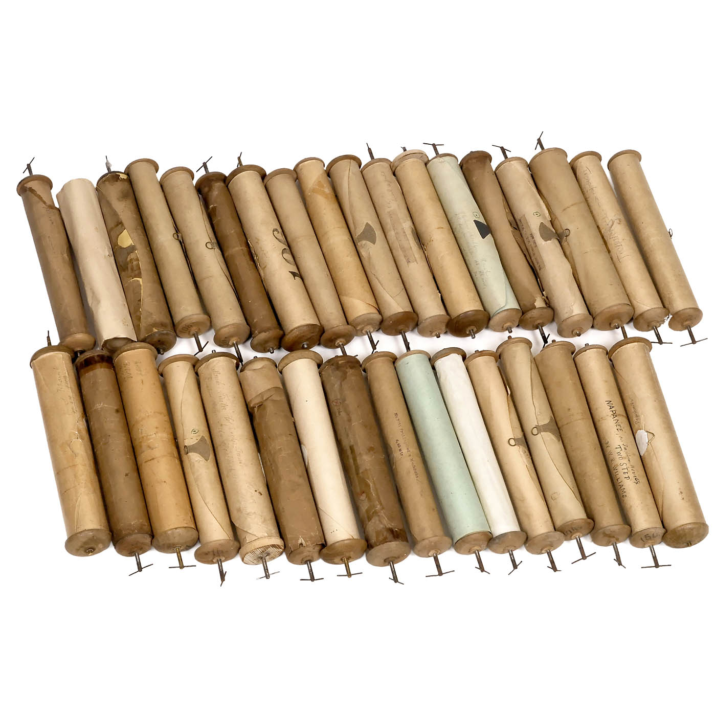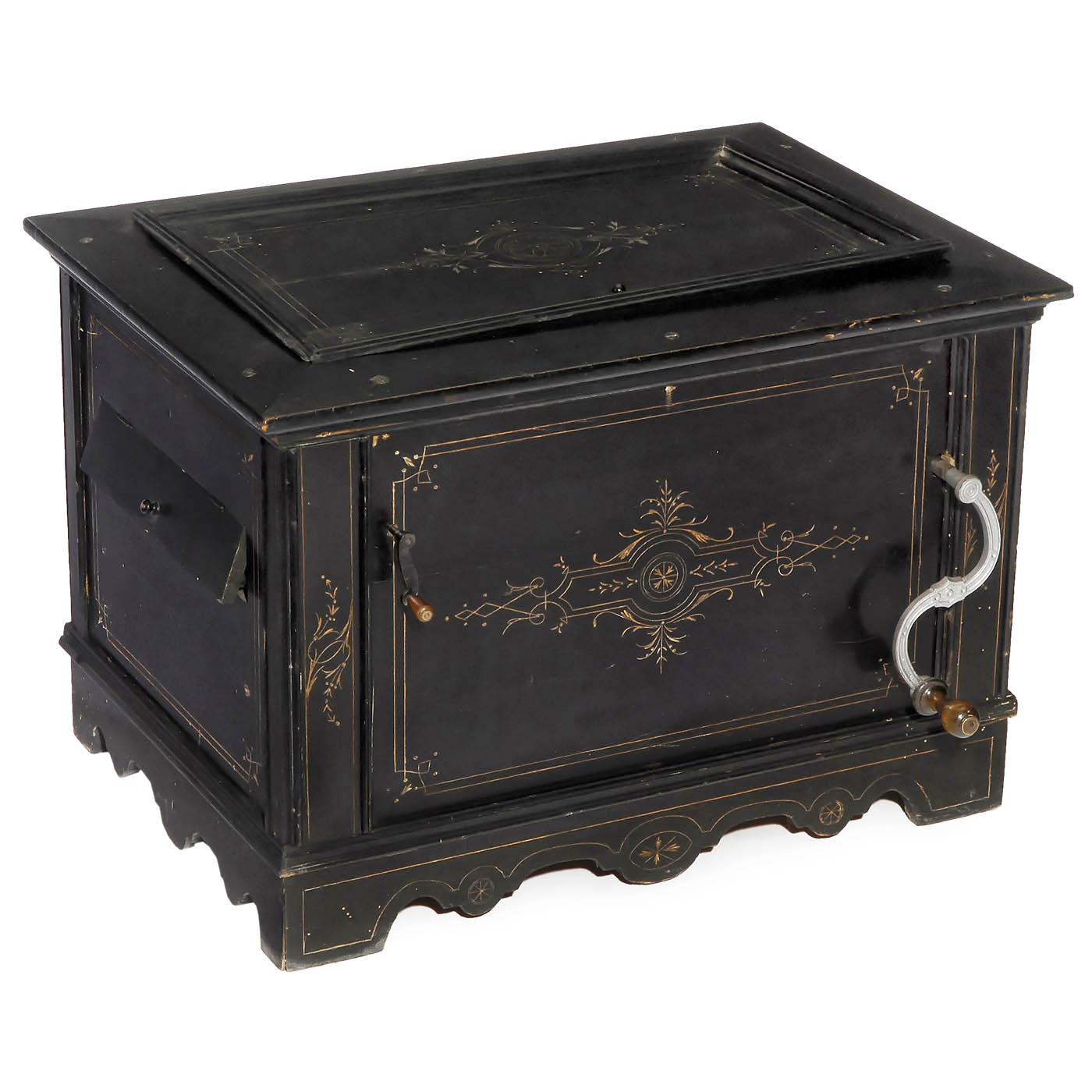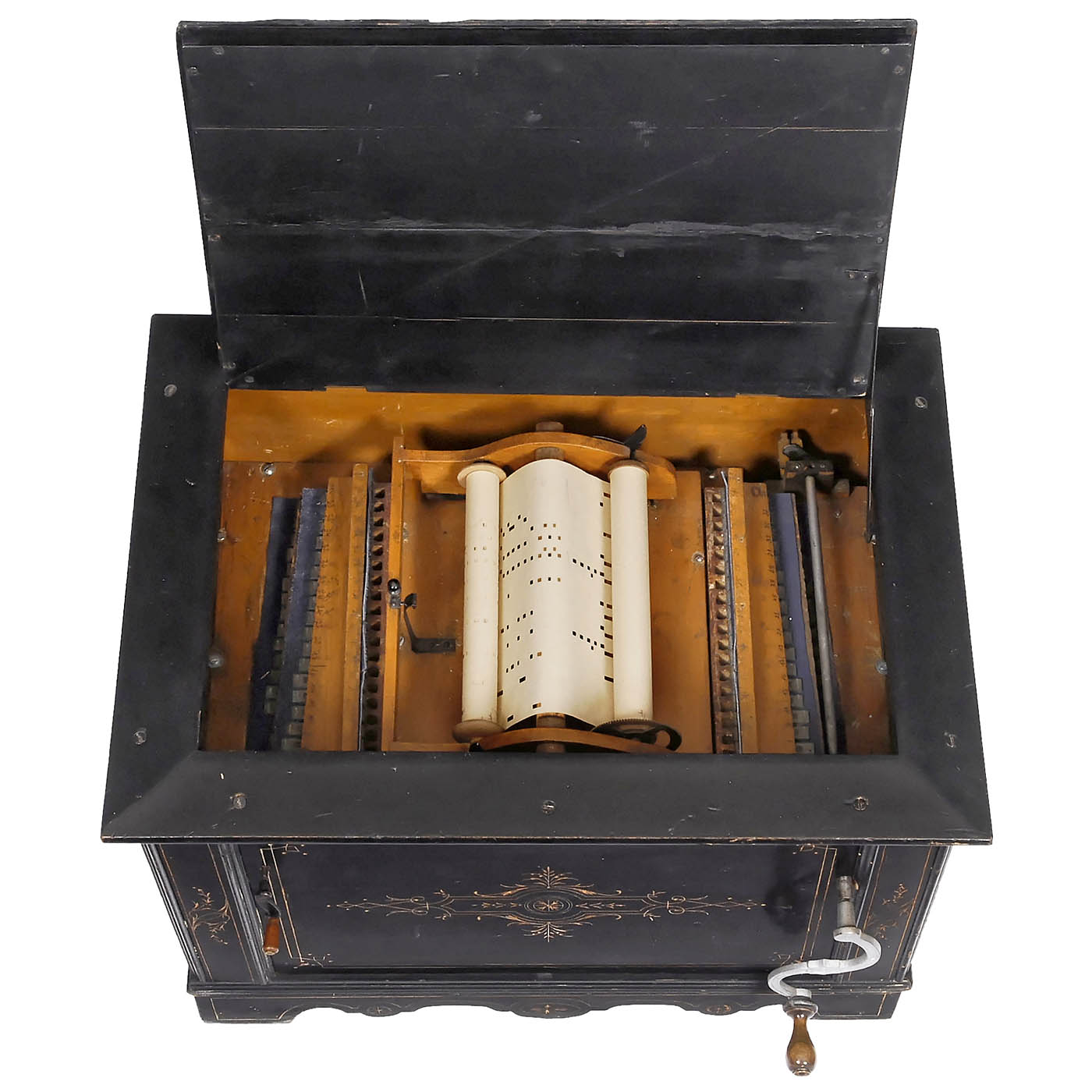 Manufactured by Bruno Geissler, Leipzig. For paper rolls, triple reed, 120 steel-tongues, handcrank-driven, small second rewind crank, black painted case, golden colored carvings, original decal, 2 lateral volume-control flaps, good playing condition, with 35 rolls (waltzes, polkas, marches and others). - The largest ever made Mignon organette, extremely rare.