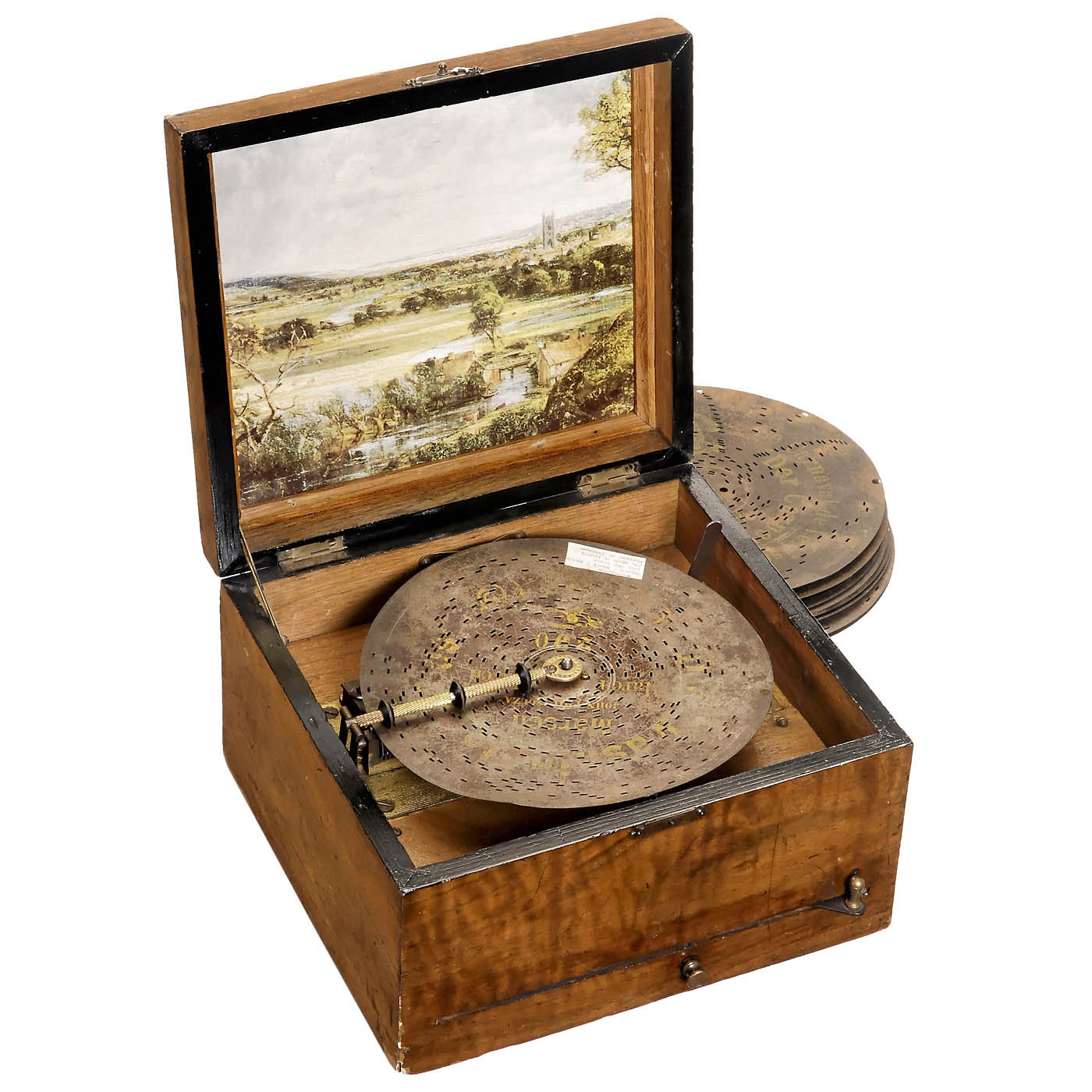 1) Polyphon model 41, for 8 in. discs, working, with 10 discs. - 2) Symphonion model 10, for 7 ¼ in. discs, missing crank, untested, with 27 discs. - And: 3) The Gem Roller-Organ, American reed organ, 20 notes, crank broken, untested, with 1 comb.