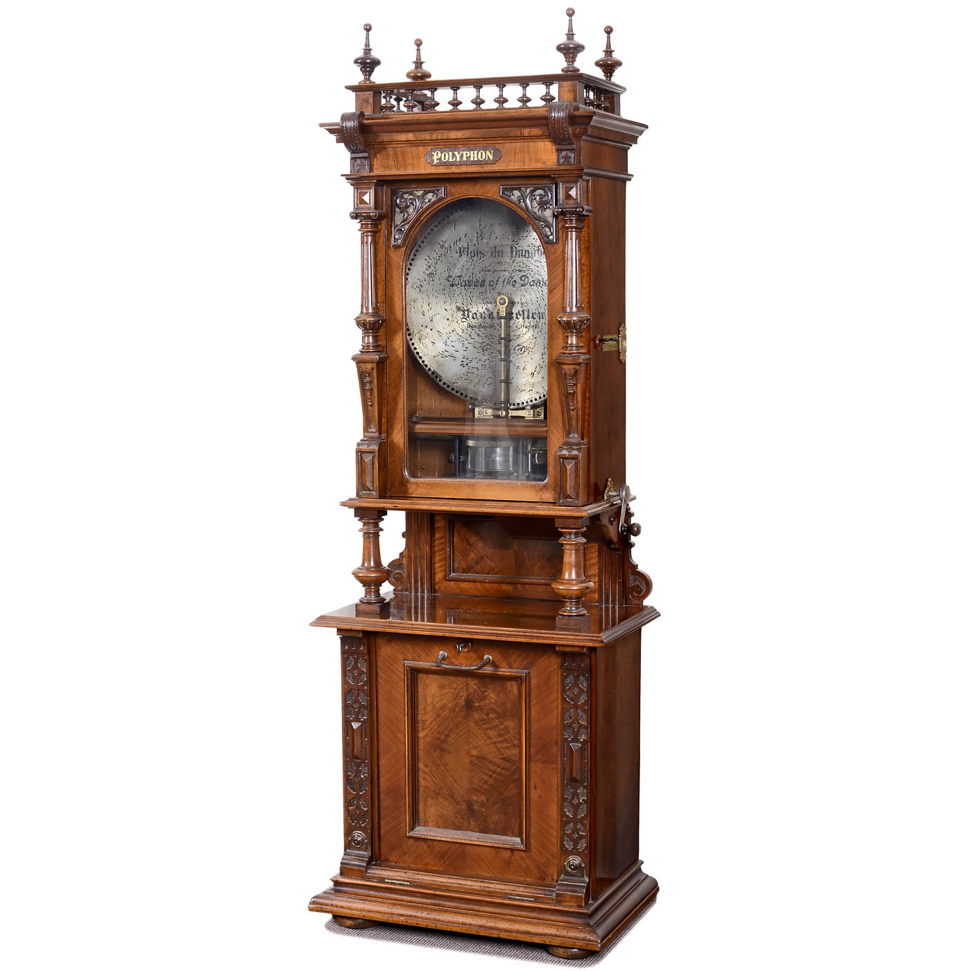 By Polyphon Musikwerke, Leipzig. For 19 5/8 in. discs, coin slot, 118 teeth in duplex comb (complete), walnut case with side coin compartment, probably later cabinet base and crown, size 26 x 17 x 84 in., with 16 discs, very good working condition.