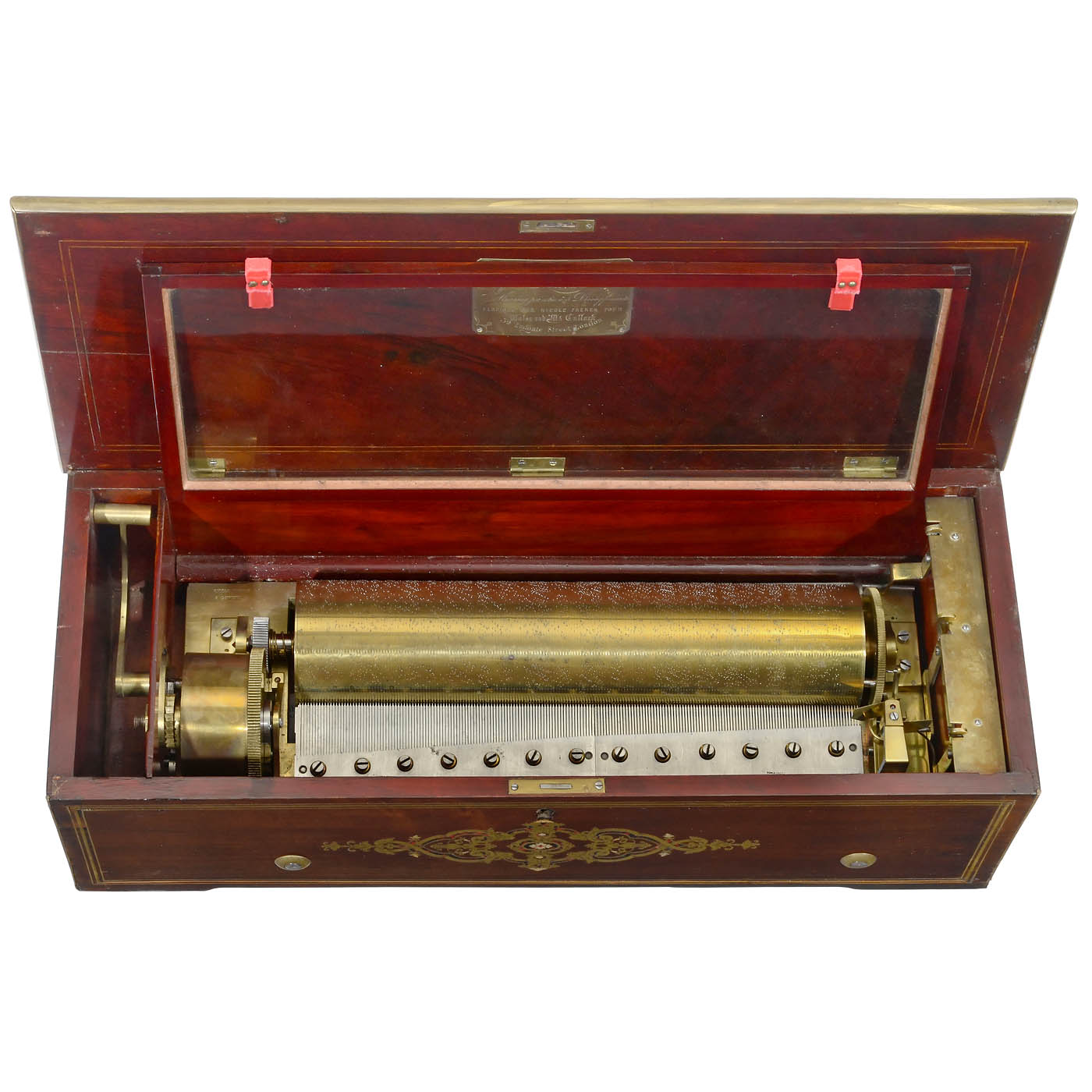 No. 38758, playing "Morning" in five developments, Gamme No. 1955, with 199 teeth in two combs (both complete) stamped "NICOLE FRERES", brass comb-washers, smooth brass bedplate stamped "NICOLE FRERES A GENEVE", double-fingered winding lever, massive spring and compensated governor with instant-stop, in veneered case with red interior and geometric inlay of brass, enamel and mother-of-pearl, the tune-plaque engraved: "Comme 5 Ouvertures Grand Format Gamme No. 1955, Morning par entier à 5 Développements, Fabriqué par Nicole Frères pour Wales & Mc.Culloch, 32 Ludgate Street, London", wd. 27 ½ in. (70 cm), cylinder 16 ¾ x approx. 4 in. diameter (42,5 x 10 cm), a couple of dampers in need of minor adjustment, otherwise in excellent playing condition. - Provenance: Acquired by the vendor from an antiques shop in Brighton, Great Britain, in March 1979. - Described by Arthur Ord-Hume as "one of the most interesting and musically spectacular styles of musical box", the variations format was perfected by Nicole Frères during the 1860s. Nicole Frères No. 38758 is highly unusual in several respects, not least in presenting a single air in five variations or "developments". The designation "comme ouvertures" presumably refers to arrangements of overture length and quality on a musical box without an operatic program. - Although the composer is not named on the plaque, the program appears to be a series of increasingly adventurous variations on Felix Mendelssohn's "Morning Song", from Volume 5 of his "Songs Without Words" (Opus 62) for the piano, published around 1842-44. - The main motif is interwoven with an embellished arrangement of the refrain from Mendelssohn's "Vaterland in deinen Gauen", better known as the melody to the English Christmas hymn "Hark ! The Herald Angels Sing" adapted by William H. Cummings in 1855. - Each development plays for around two minutes, with a complete playing time of ten minutes for all five. The program was evidently intended to be enjoyed in its entirety as the stop function (inactive) consists of a brass plate with five pins and a single notch to halt the movement at the end of the sequence. - A grand-format musical box with a rare and remarkable repertoire.