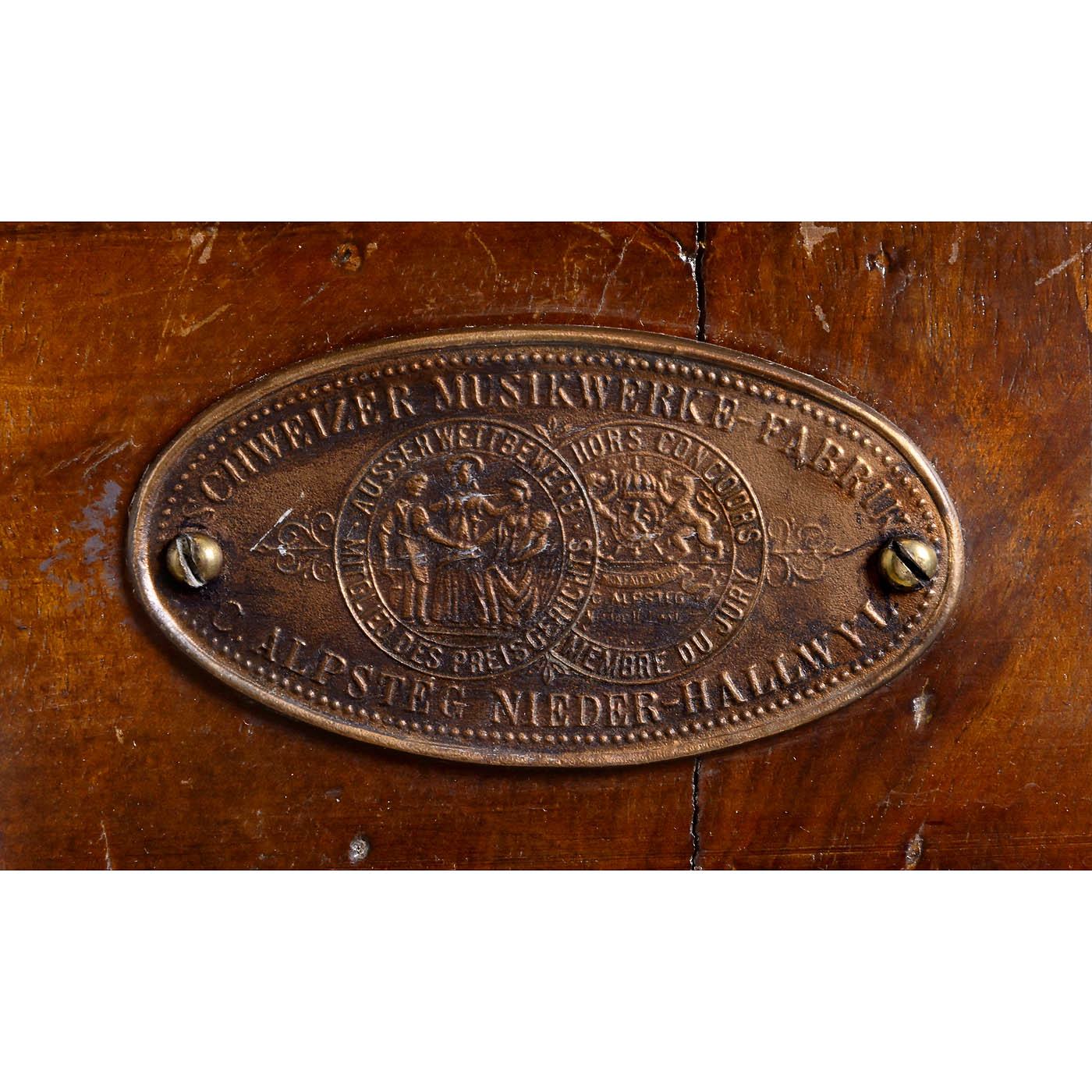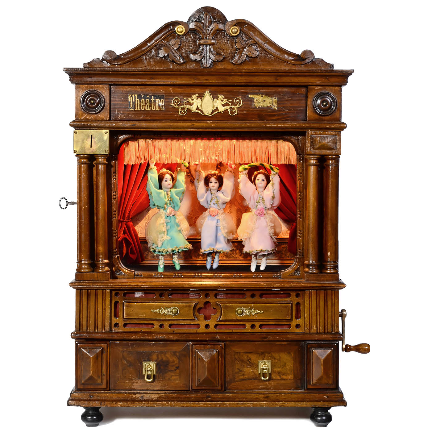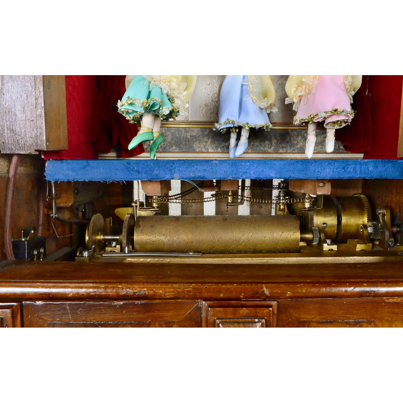 With eight-air coin-operated movement operating three replacement dancing dolls and the rise and fall of the curtain, in stained-wood case with glazed proscenium flanked by turned columns, electric illumination, coin-slot, coin-drawer, removable sound fret for accessing the mechanism and plaque: "Schweizer Musikwerke-Fabrik, C. Alpsteg, Nieder-Hallwyl", ht. including pediment 31 ½ x wd. 21 ¼ (80 x 54 cm), cylinder 8 ¼ in. (21 cm), interior decoration renewed, dolls now operated by chain-drive, movement not examined out of case, good working and playing condition. With wood-handled crank. - The musical instrument firm C. Alpsteg of Hallwil, in the Swiss Aargau canton, was founded in 1889 and operated until around 1914/15.