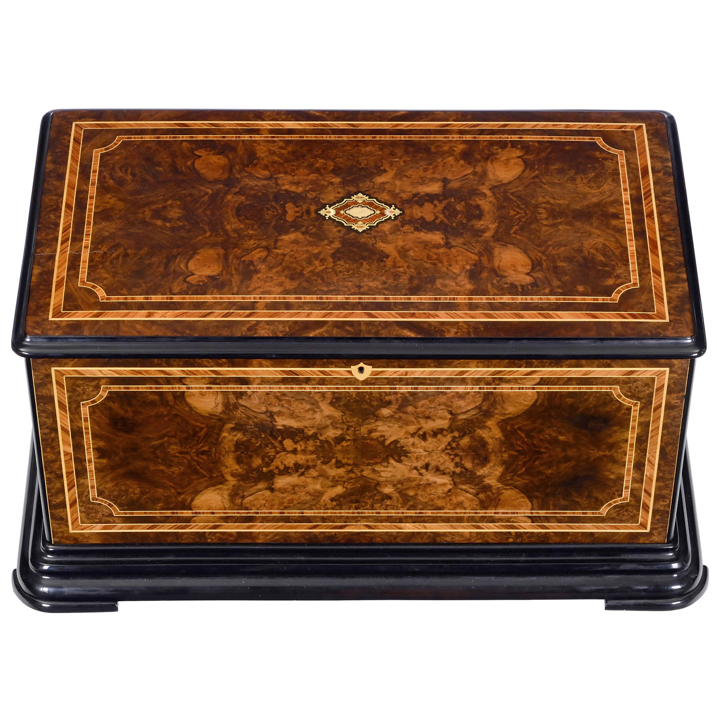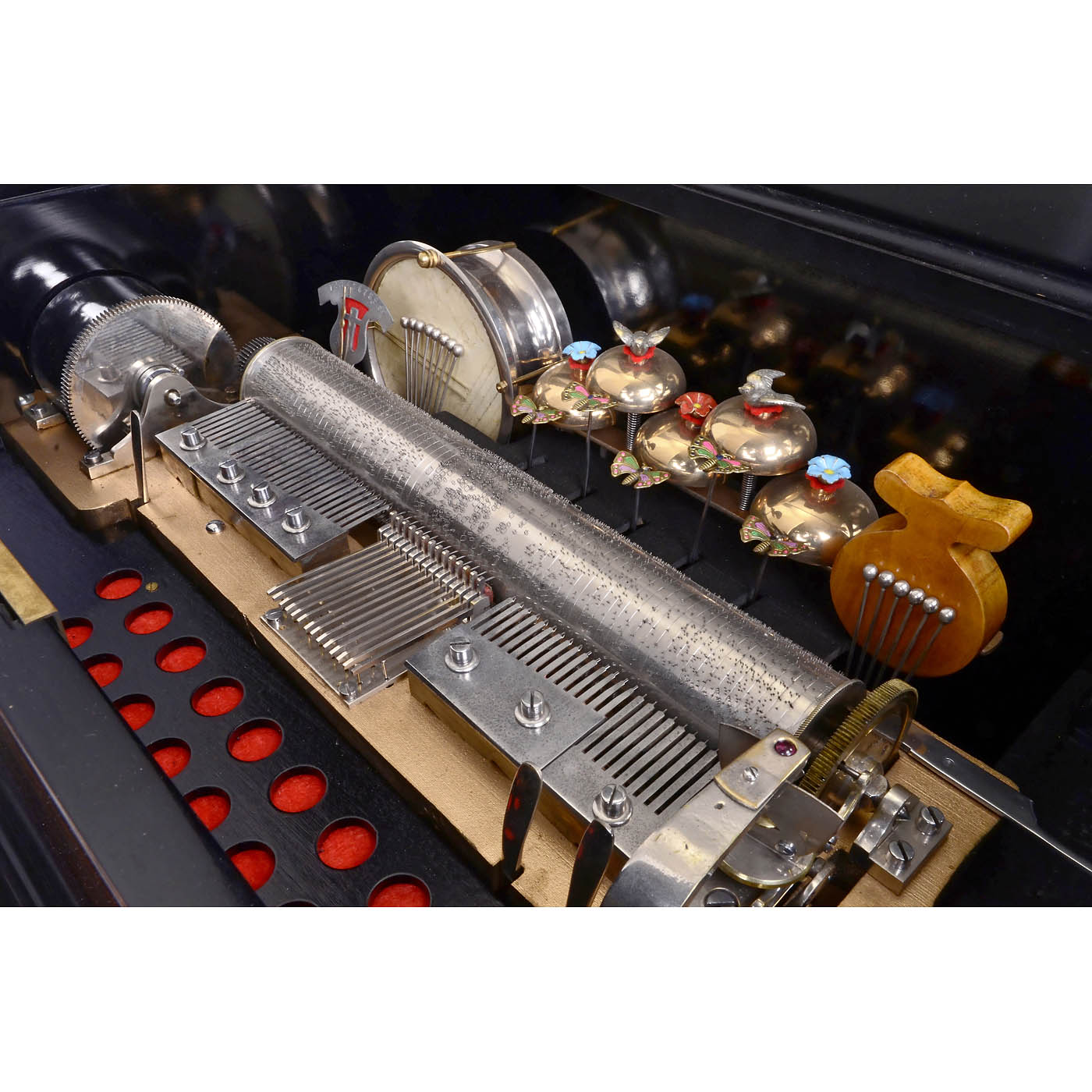 No. 32810, playing ten oriental airs accompanied by 14-note organ, drum, castanet and five bells with butterfly strikers, bird and flower finials, with 35 teeth in musical comb and 19 teeth in the two optional percussion combs (complete, three neatly replaced tips), nickel-plated movement, tune-indicator and walnut-veneered case with kingwood banding and inlaid brass and mother-of-pearl motif on the lid, wd. 27 ½ in. (70 cm), cylinder 13 in. (33 cm), movement in good restored playing condition, split in lid. An impressive musical box with lively percussion accompaniment.