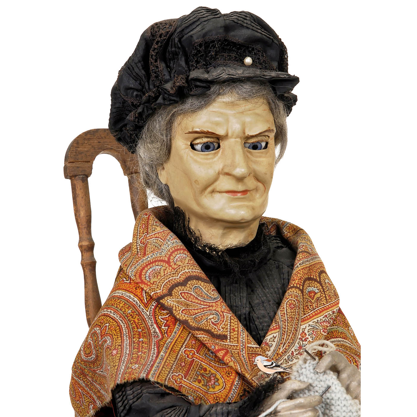 With composition head, defined features, strong nose and chin, articulated threaded blue glass eyes with leather eyelids, original paint finish, carved wood hands and legs, seated on turned spindle-backed chair, her torso containing open-spring motor causing the figure to nod her head, lower her eyes and rotate the knitting needles, dressed in probably original black silk dress, cap, lace-trimmed cotton apron and paisley shawl, ht. 19 in. (49 cm), silk skirt fragile, otherwise in good unrestored working condition!