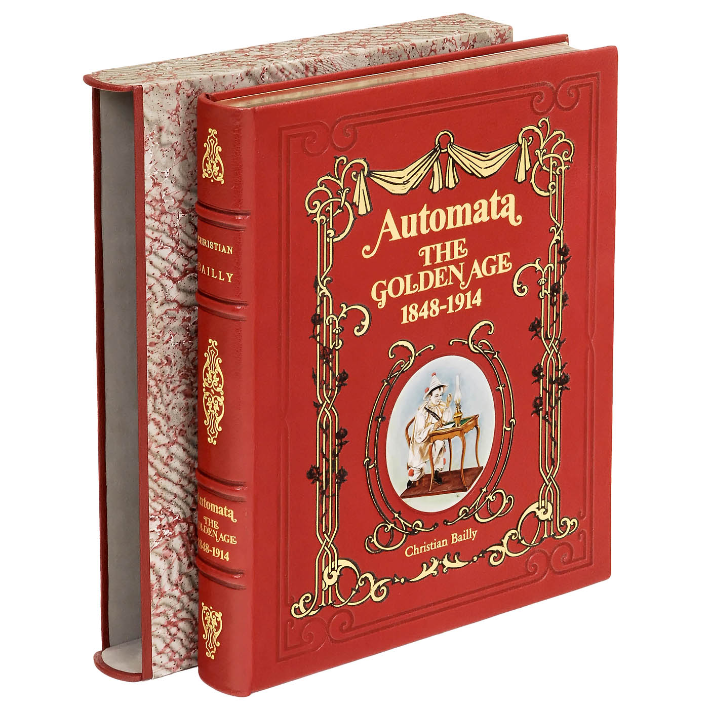 Christian Bailly, Sotheby's Publications. No. 22 of limited deluxe edition of 25, 360 pages, illustrated with 150 color and numerous black-and-white photographs, and over 120 pages with facsimile reproductions of catalogues of Vichy, Triboulet, Roullet & Decamps and Lambert. Gilt-edged pages, embossed and gilt-tooled leather binding with hand-painted roundel and loose-leaf pen-and-ink watercolor drawing by Madame Andrée Kiefer, in marbled slipcase, size 10 x 12 ½ in. - Rare presentation copy of the authoritative reference work on French automata.